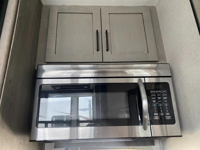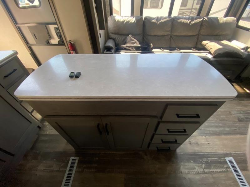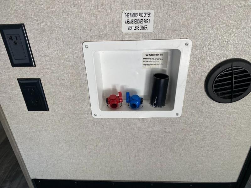 With its queen-size bed, four-seat recliner, loft with twin bed, dual opposing sofas, and electric bunk, this Raptor toy hauler gives you plenty of accommodations to sleep eight people comfortably each night. And everyone in your group will appreciate having a full and half bathroom available. The kitchen will be your family's favorite place to enjoy an afternoon snack with the flip-up bar stools at the kitchen island, and you will be able to reheat last night's leftovers quickly with the convection microwave. You might even like to add a washer/dryer option in the garage if you plan to stay awhile.