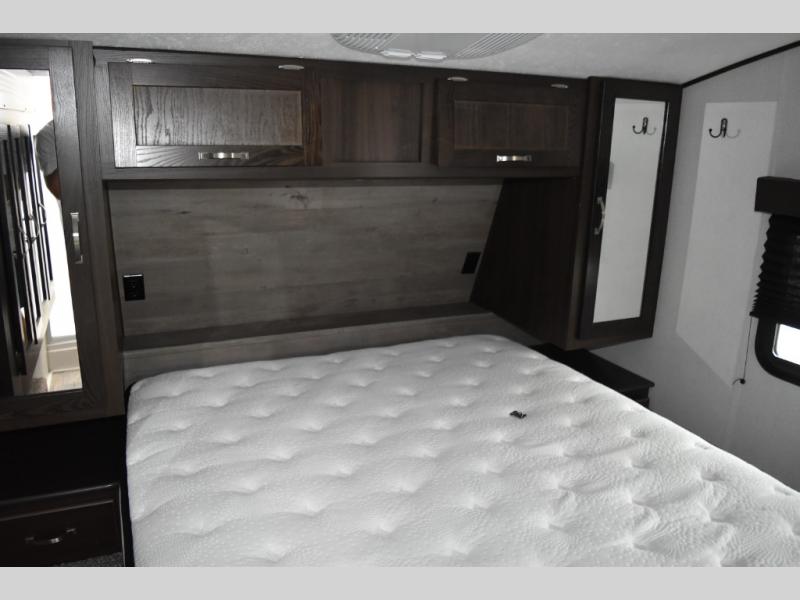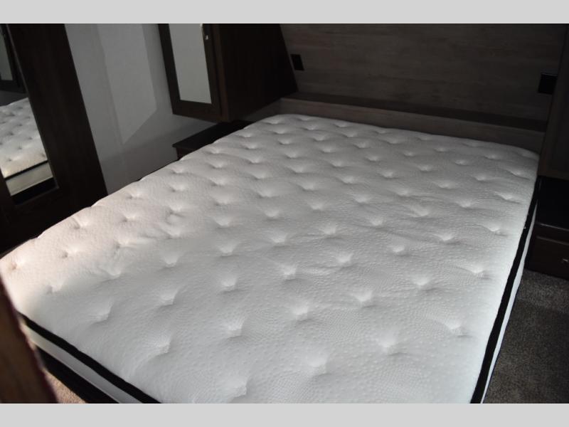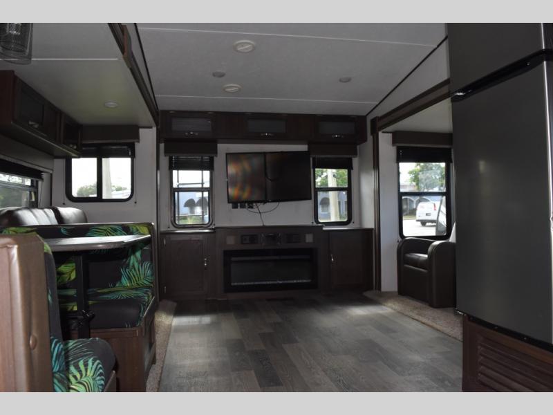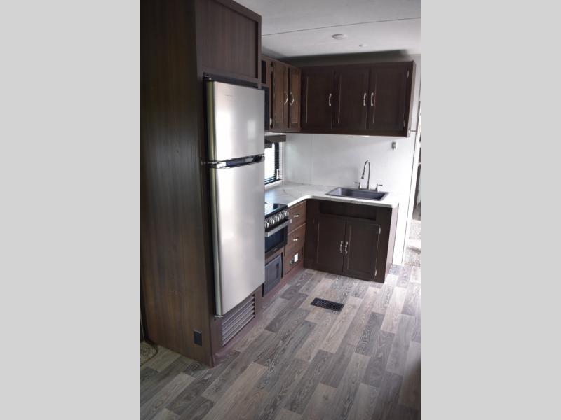 Step inside this Keystone Springdale fifth wheel and see just how easy camping can be. This unit features three slides for added interior space, a rear entertainment center, and a front master suite. In the bedroom, you will find a comfortable queen bed for you to enjoy a good night's rest and closets on either side for you to keep your clothes neat and tidy, plus there is also a wardrobe. You even have access to the dual-entry bath, which will come in very handy at night. The rear wall offers a full entertainment area with a 50" LED TV. If it is a lazy day, turn on the TV and enjoy a movie with a blanket in front of the fireplace. There are plenty of overhead cabinets for all of your storage needs, plus some lower cabinets as well!