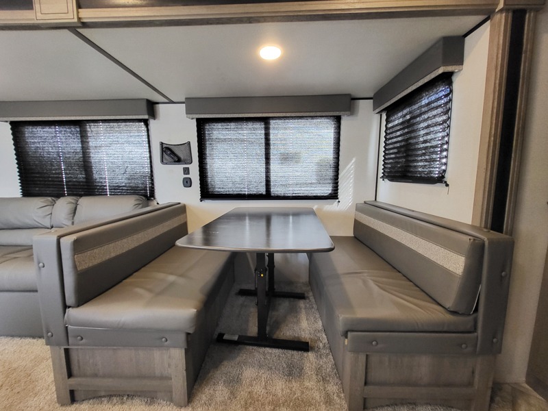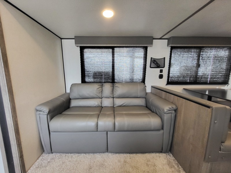 This rear living Springdale travel trailer features a large slide for added interior space, a booth dinette for meals, and two entry doors for convenience. The owners will have their own queen bed in the front private bedroom for a separate place to chill. The booth dinette and the sofa can both fold down into sleeping space after you have enjoy relaxing, dining and playing games. There is also plenty of storage space with overhead cabinetry, kitchen cupboards, and bedside closets, so you can bring whatever you need with you to make your next camping trip enjoyable!