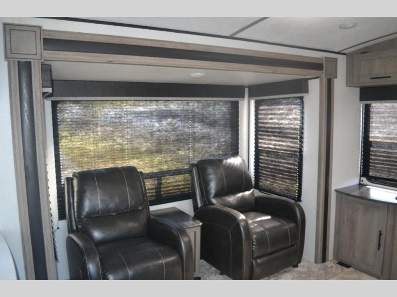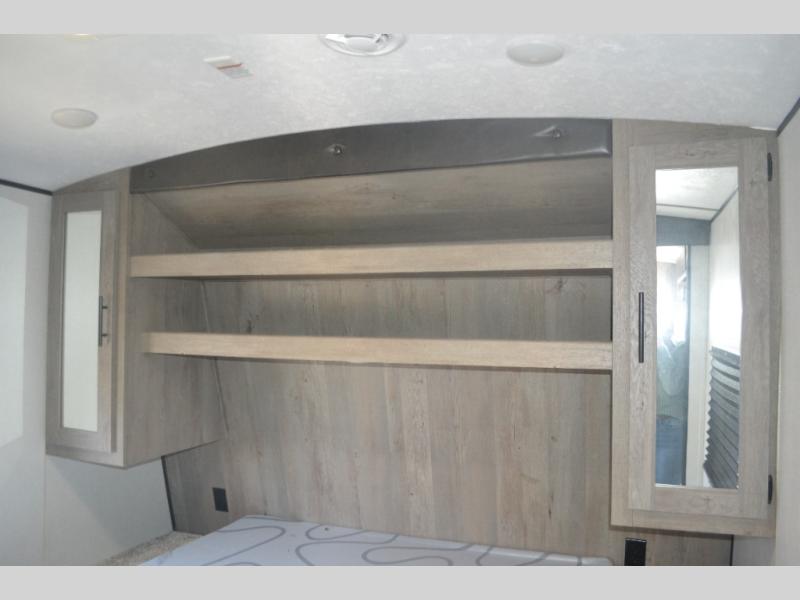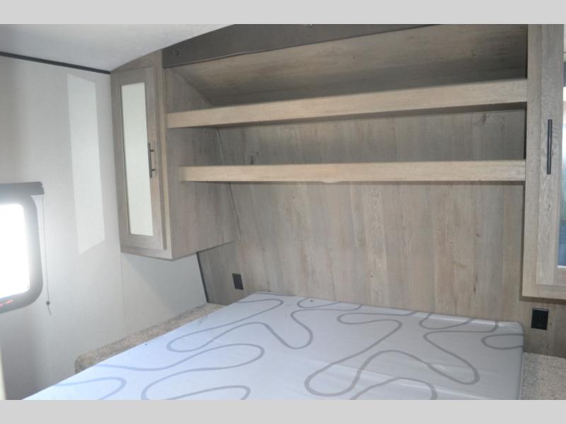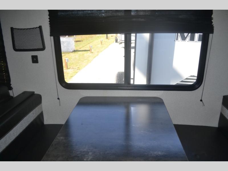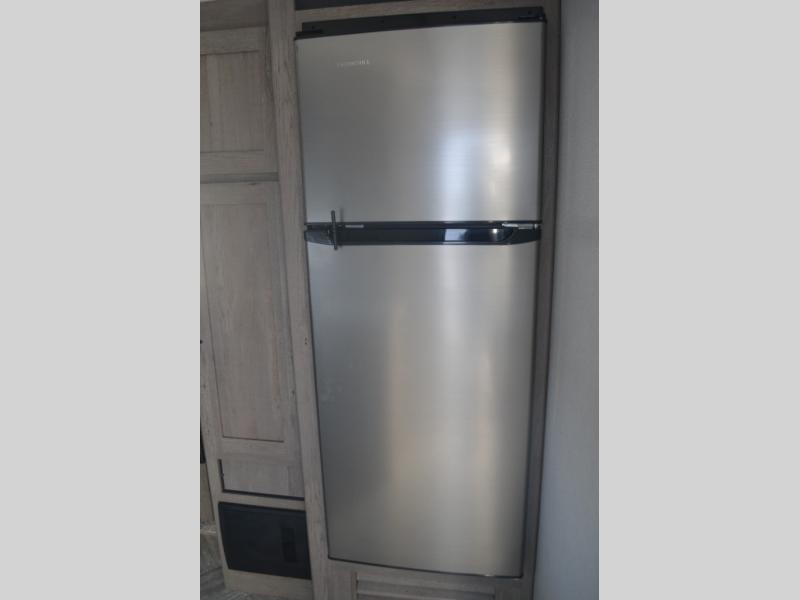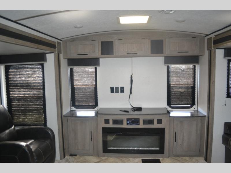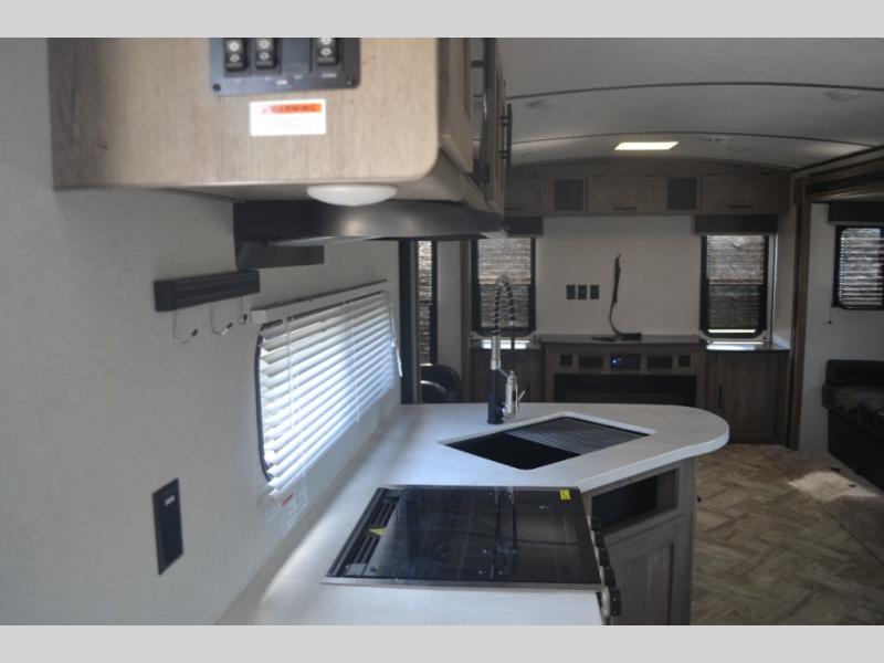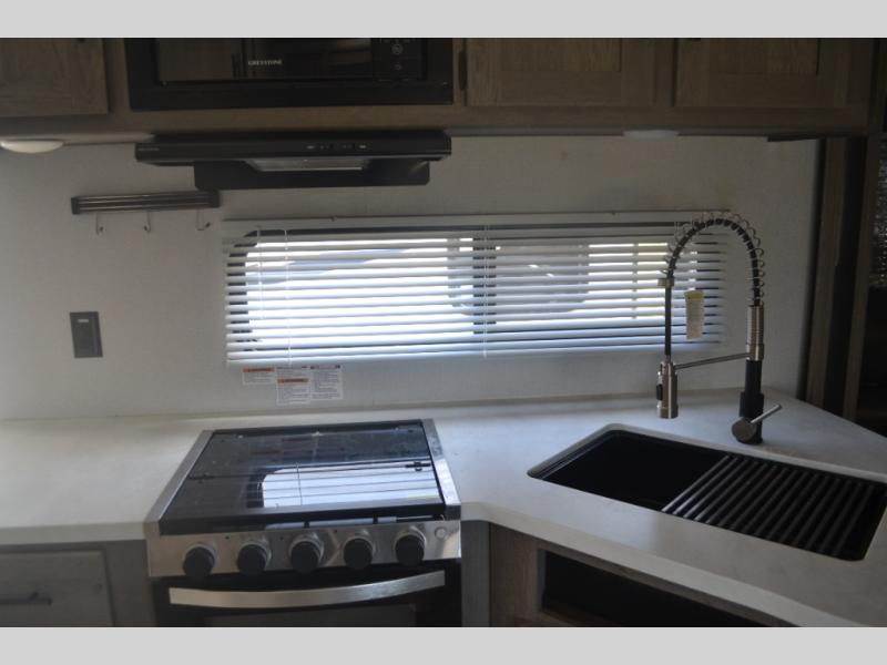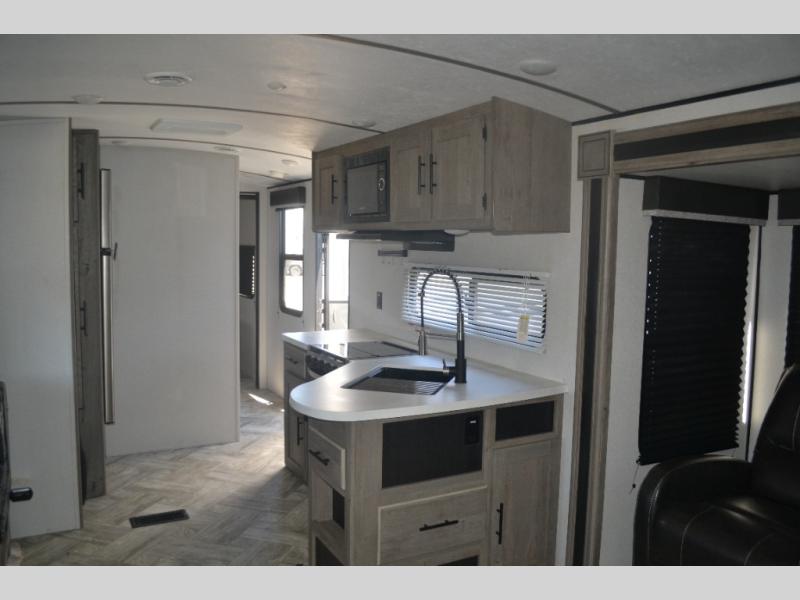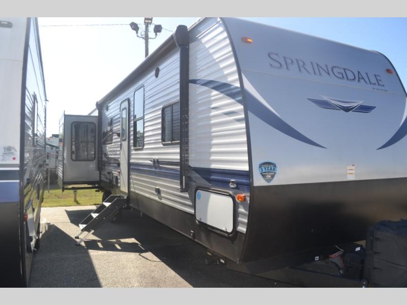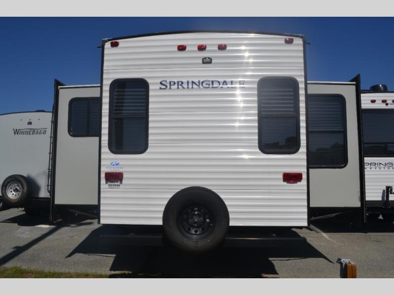 Your kiddos or guests are going to love this Keystone Springdale travel trailer! There is a full-width entertainment center with an LED TV and a fireplace along the rear wall for a perfect view from anywhere in the main living and kitchen area. You can choose from a few places for relaxing, eating your meals, or just enjoying one another's company with the two recliners and an end table between them, the sofa, and the booth dinette. The sofa and dinette are part of the Do More collection allowing you maximum comfort. The chef in the kitchen will enjoy having a place to cook all of the family favorites, and after a long day of adventuring, you will have the private front master bedroom with a queen bed for a good night's rest.
