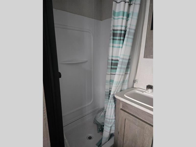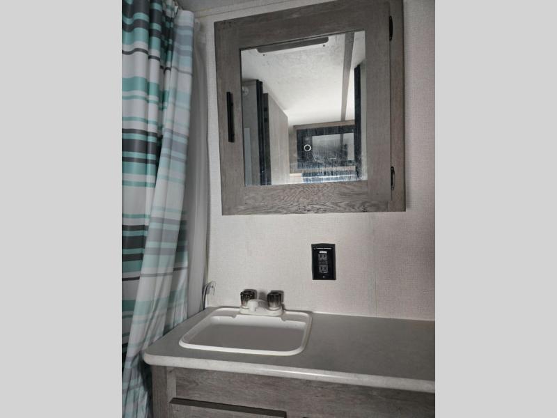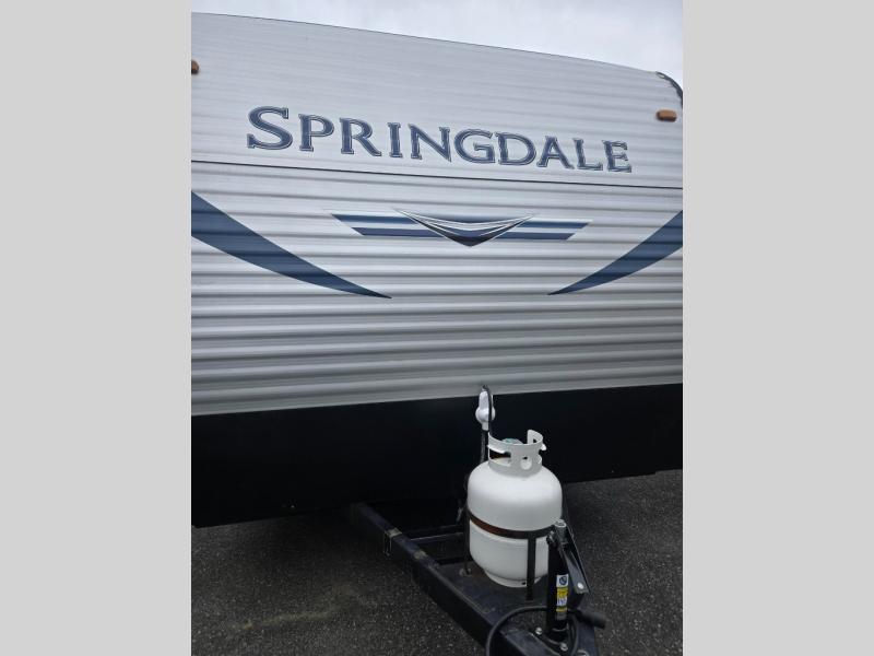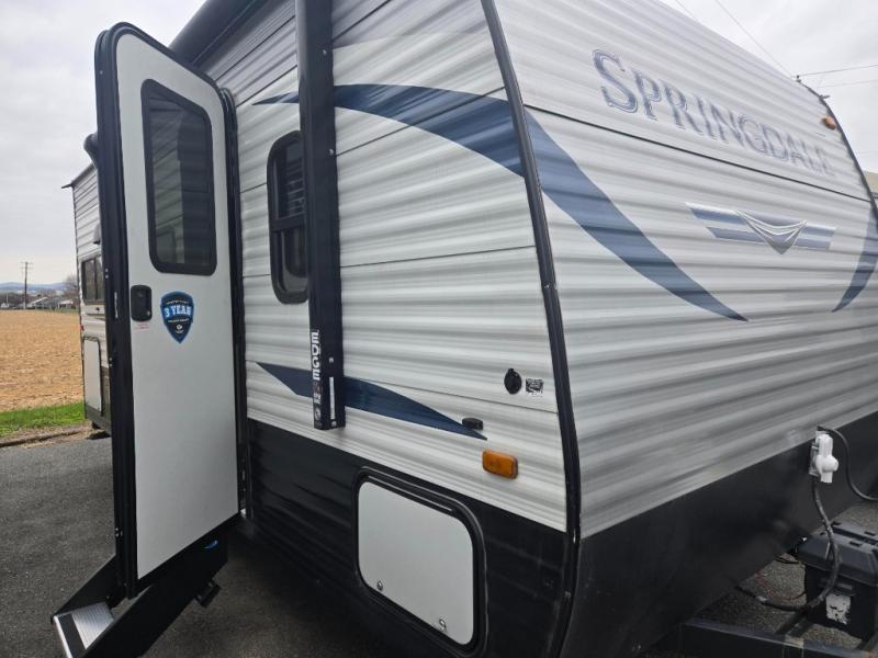 If you're ready for camping near or far, you will want an easy to tow, lightweight Keystone Springdale Mini travel trailer. These models include a power awning with LED lights, a pass-through storage compartment for all your gear, and LCI SolidStep entry steps for your convenience. The interior is made bright and open with a Whitewashed brick accent wall, larger windows, and lighter vinyl flooring throughout. You will find many convenient storage solutions, such as wall-mounted cargo nets next to each USB port for your tablet, camera, or phone, two shelves above the bed for your books, and easy access storage under the sofa or bunks where applicable. These travel trailers also include safety measures for your peace of mind, including GFI receptacles, smoke and carbon monoxide detectors, a fire extinguisher, plus more!