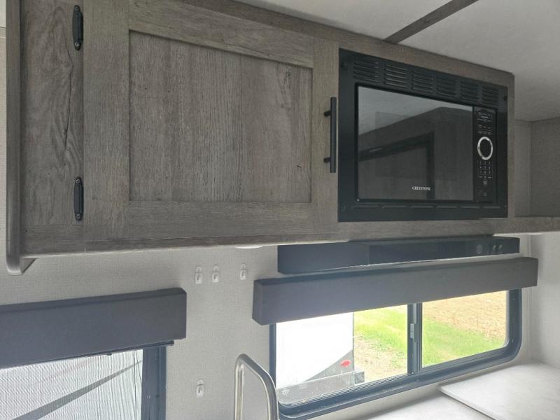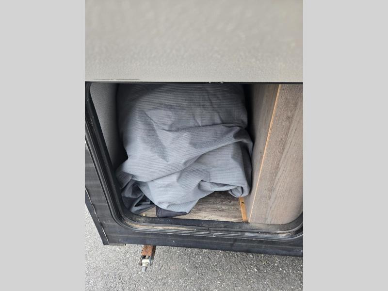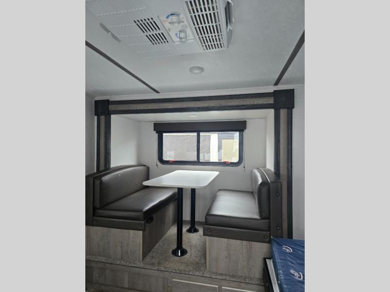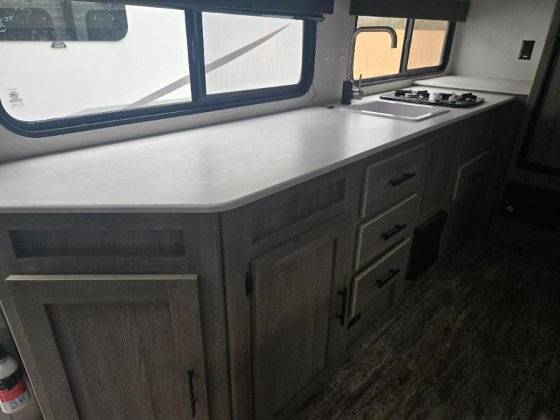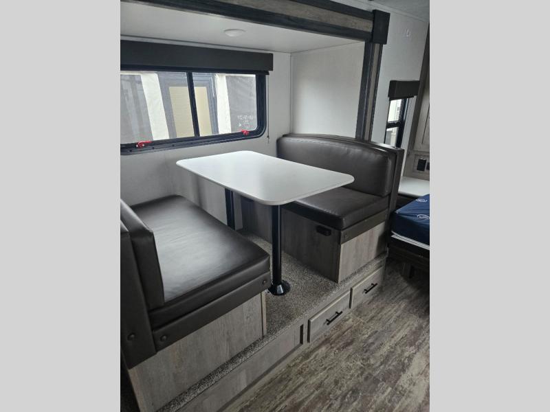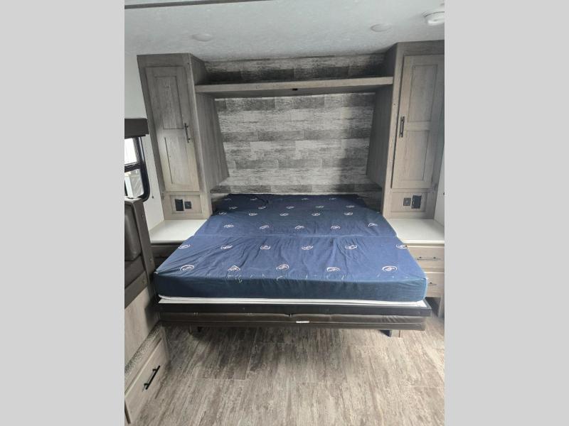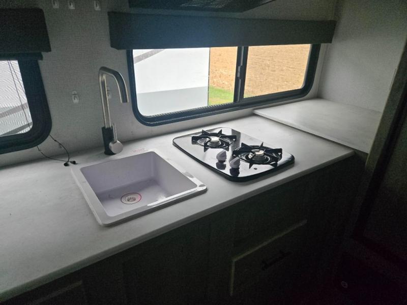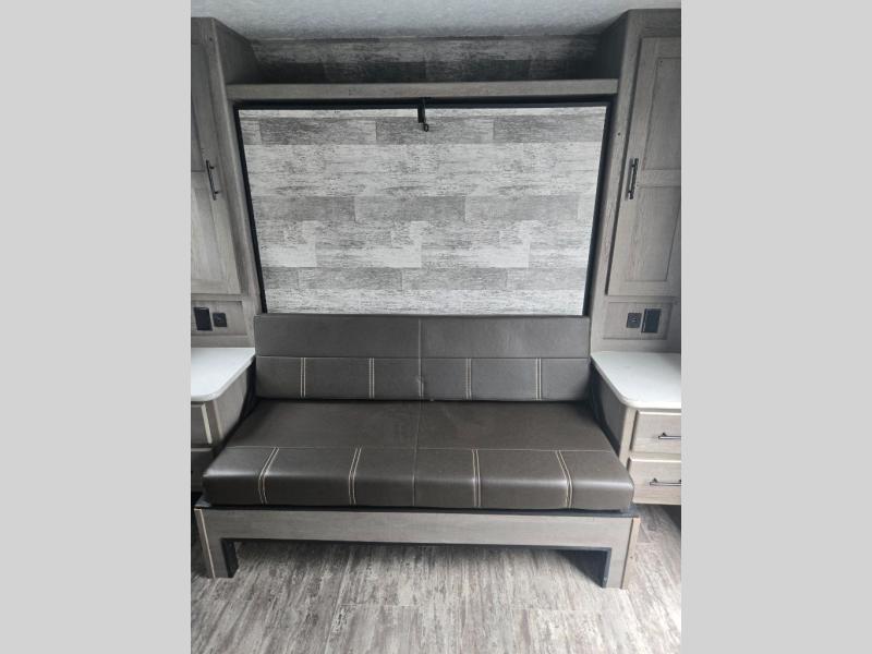 This is the perfect couple's trailer to take to the lake or your favorite campground. The versatile queen Murphy bed provides a sofa to relax on during the day, and comfortable sleeping space at night. If you have any overnight guests, they can sleep on the slide out booth dinette when it's not being used for meal times. You'll find under-seat drawers for throw blankets or flashlights, dual closets on each side of the Murphy bed for your clothes, plus convenient shoe storage under the sofa so you won't trip over them at night. You will appreciate ample counter space in the kitchen, along with a two burner cooktop to prepare meals. This model also includes dual end tables with 110V outlets and USB ports for your phone!