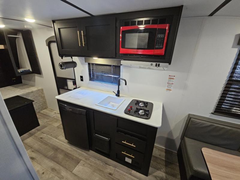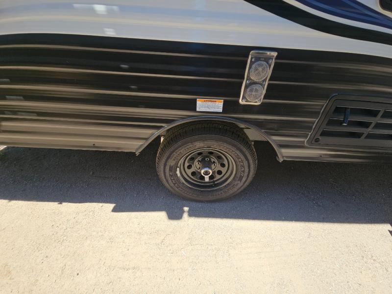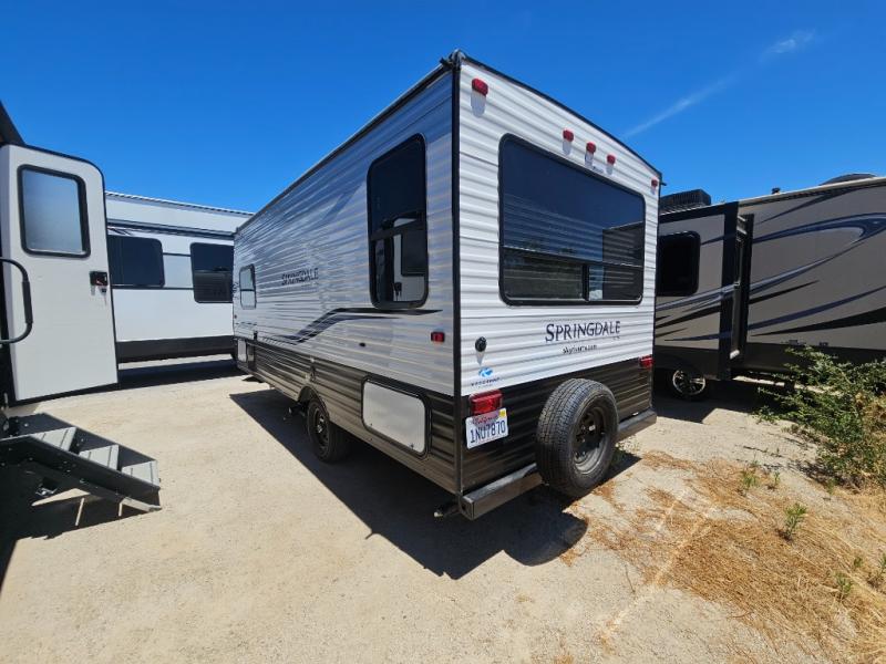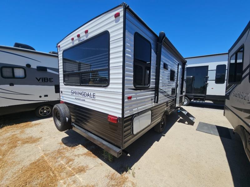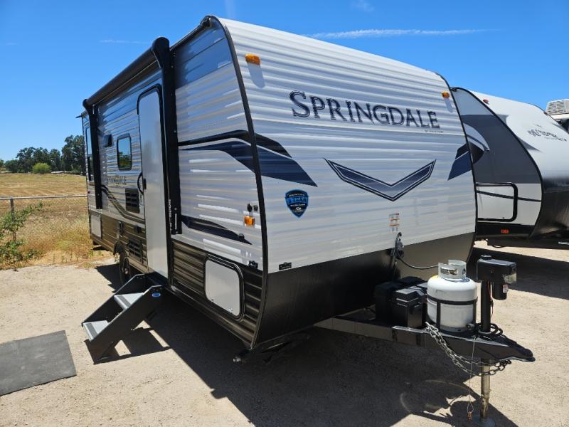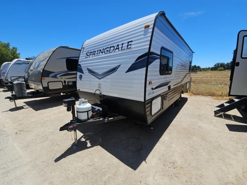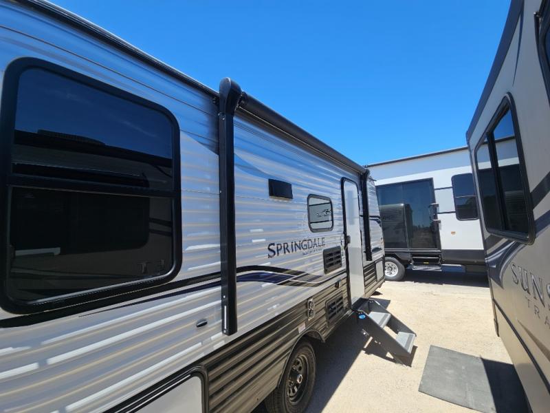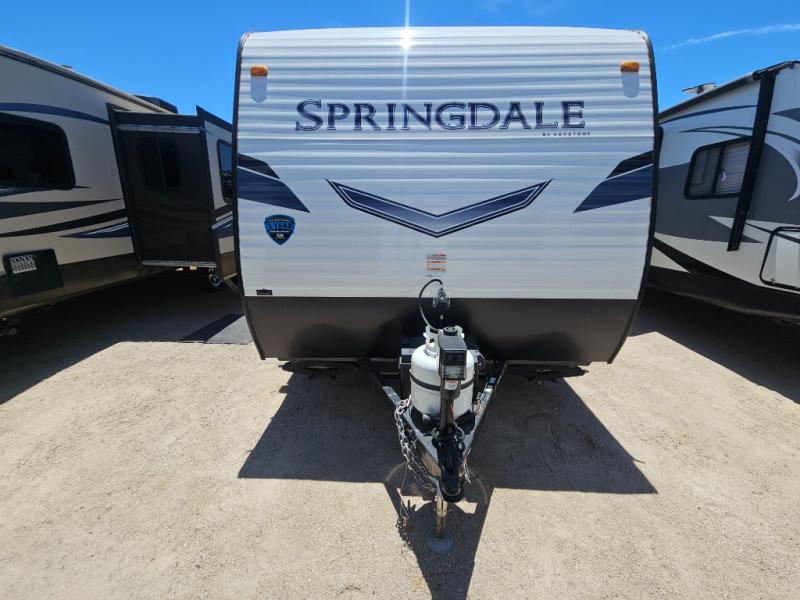 If you're ready for camping near or far, you will want an easy to tow, lightweight Keystone Springdale Mini travel trailer. These models include a power awning with LED lights, a pass-through storage compartment for all your gear, and LCI SolidStep entry steps for your convenience. The interior is made bright and open with a Whitewashed brick accent wall, larger windows, and lighter vinyl flooring throughout. You will find many convenient storage solutions, such as wall-mounted cargo nets next to each USB port for your tablet, camera, or phone, two shelves above the bed for your books, and easy access storage under the sofa or bunks where applicable. These travel trailers also include safety measures for your peace of mind, including GFI receptacles, smoke and carbon monoxide detectors, a fire extinguisher, plus more!