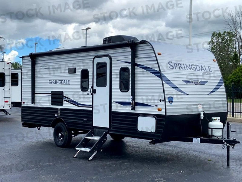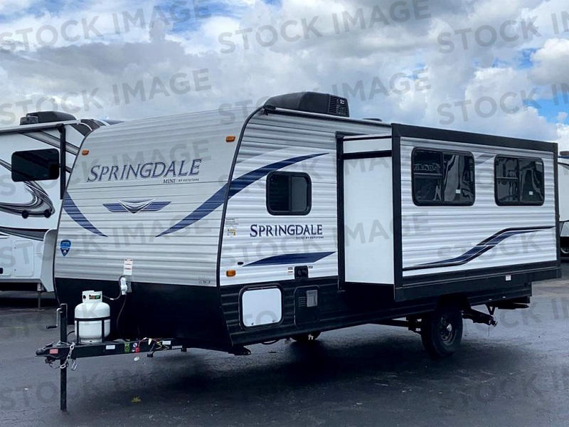 If you're ready for camping near or far, you will want an easy to tow, lightweight Keystone Springdale Mini travel trailer. These models include a power awning with LED lights, a pass-through storage compartment for all your gear, and LCI SolidStep entry steps for your convenience. The interior is made bright and open with a Whitewashed brick accent wall, larger windows, and lighter vinyl flooring throughout. You will find many convenient storage solutions, such as wall-mounted cargo nets next to each USB port for your tablet, camera, or phone, two shelves above the bed for your books, and easy access storage under the sofa or bunks where applicable. These travel trailers also include safety measures for your peace of mind, including GFI receptacles, smoke and carbon monoxide detectors, a fire extinguisher, plus more!
