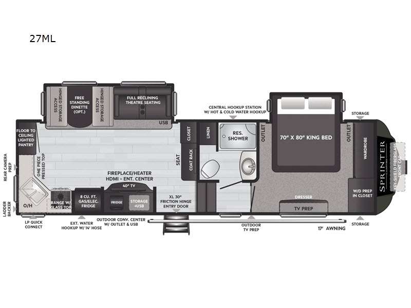 Load up and head out to your local state park in this Sprinter fifth wheel! You can set up the two slides to enjoy extra floor space, and there is plenty of storage in this model with the floor-to-ceiling pantry, the linen cabinet in the full bathroom, and the bedroom's full-width wardrobe. You can even add an optional washer/dryer to the closet too. Now imagine relaxing outside under the awning while using the outdoor convenience center and the exterior refrigerator. If you enjoy more inside time, turn on the 40" LED HDTV and relax on the full-reclining theater seating. The rear kitchen includes everything you will need to stay fed such as a range with glass top, a microwave, a large kitchen sink, and plenty of counter space. Take a look to see what else you will love about this unit!