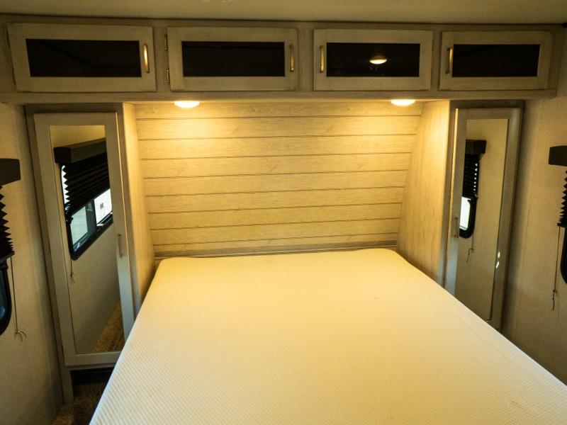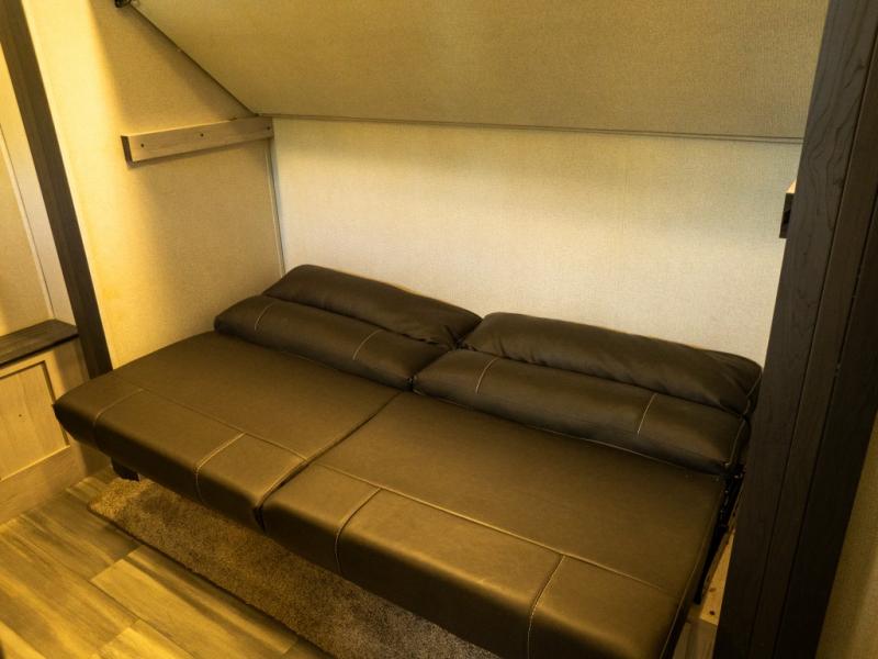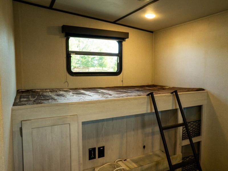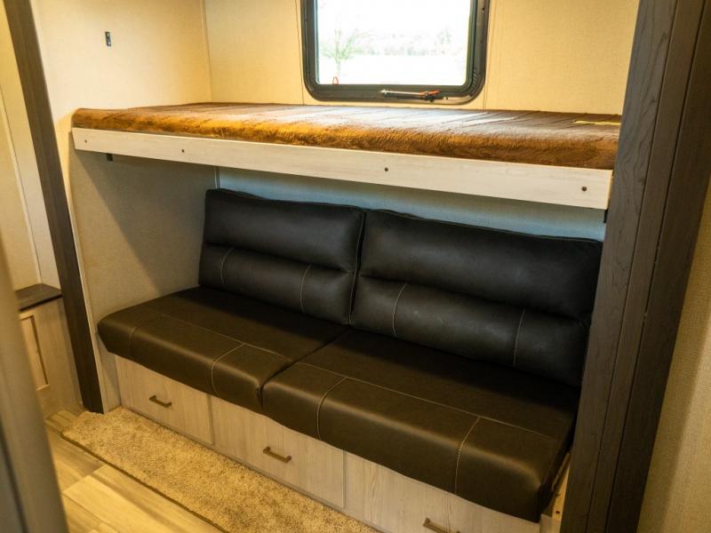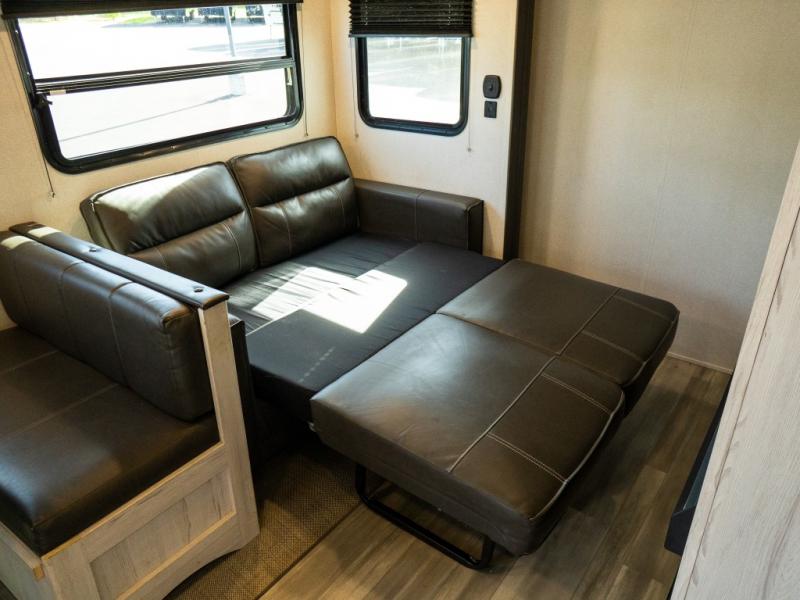 Just imagine this Sprinter fifth wheel loaded up for the three-day weekend that starts now! You and your family or friends can safely drive to the state park to meet your camping friends. Quickly set up the triple slides for more interior room when you aren't fishing, hiking, or walking around the campgrounds. Your children or friends will love having privacy in the bunkhouse and their own bunk or sleeper sofa to relax and unwind on after a fun-filled day, plus they even have a half bath to themselves. You can retire to your own master suite with a residential queen-size bed and a private entry door into the dual-entry bathroom. The cook will love all the counter space in the kitchen, and everyone will appreciate all the floor space throughout. You can even cook outdoors, and the premium outdoor convenience center will be a dream.
