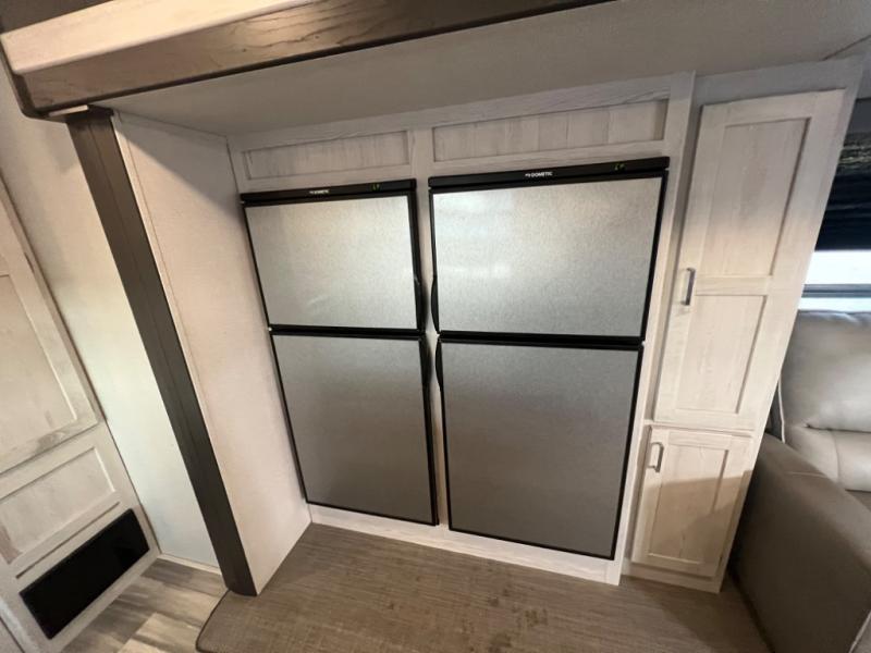 Don't pass up your chance to camp in true luxury with this Sprinter Limited travel trailer! The rear kitchen gives you more space to walk around as you prepare a delicious meal, and the pantries on either side of the glass top range with a range hood help keep all of your cooking needs right by you. The breakfast bar with three bar stools wraps around the XL sink and faucet to make your clean-up even easier too. Your whole family will love the living area. Just grab a drink from one of the two 7-cubic foot refrigerators and relax on either the tri-fold sofa that can turn into a queen-size bed or the full reclining theater seating. There is even an HDMI entertainment center with a 50" TV and a fireplace for true comfort!