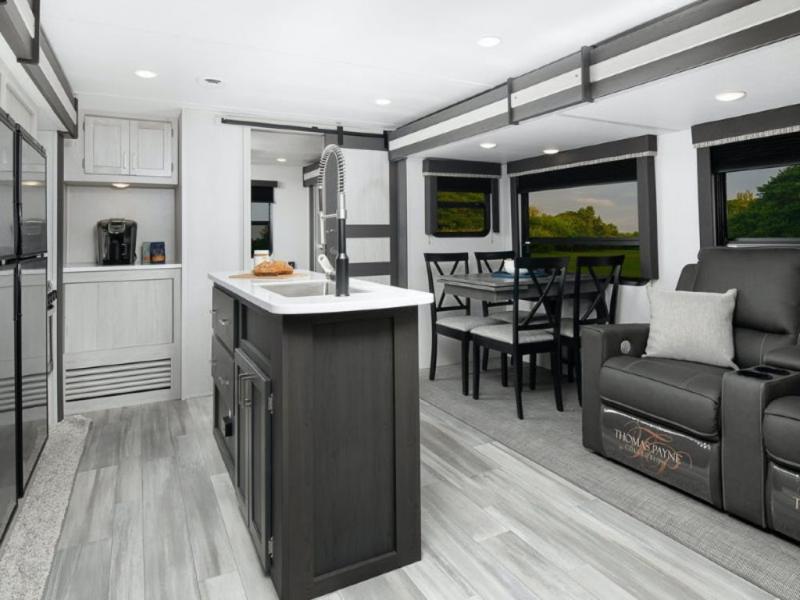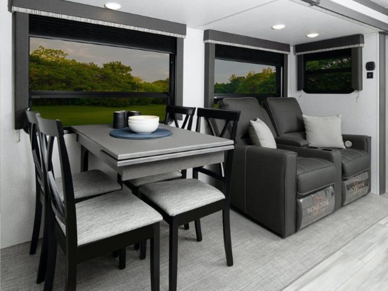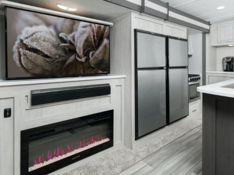 It's time you do camping the right way with this Sprinter Limited travel trailer! The front kitchen makes it easy for you to move around as you create a delicious meal. With two pantries and two 7-cubic foot refrigerators, you can be sure to have enough room for everyone's favorite drinks and snacks. The free-standing dinette with four chairs and a live edge table top offers a comfortable place for you to enjoy your meals. What better way to wind down your nights than to relax on either the full reclining theater seating or on the tri-fold sofa which can transform into a queen-size bed while you watch your favorite movie on the 50" TV and enjoy a fire going in the fireplace below. There is even an outdoor convenience center with a two burner cooktop, a refrigerator, and USB ports to charge your gadgets.