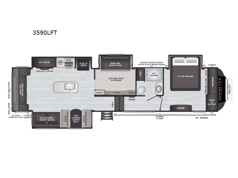 The best part about this Sprinter Limited fifth wheel is the fact that it has two bedrooms! The front private bedroom has a king bed slide, a dresser, a large wardrobe with mirrored doors, and a closet that has been prepped for a washer/dryer. The second bedroom is located directly next to the kitchen, and it has a tri-fold sofa slide and a loft area above. The main living area/kitchen is going to be easy to relax in because it has lots of space thanks to a set of opposing slides. In this area, you can work around the kitchen island with ease, put your feet up on the tri-fold sofa as you enjoy the heat from the fireplace, or rest in the full reclining theater seating as you watch the LED HDTV across from you.