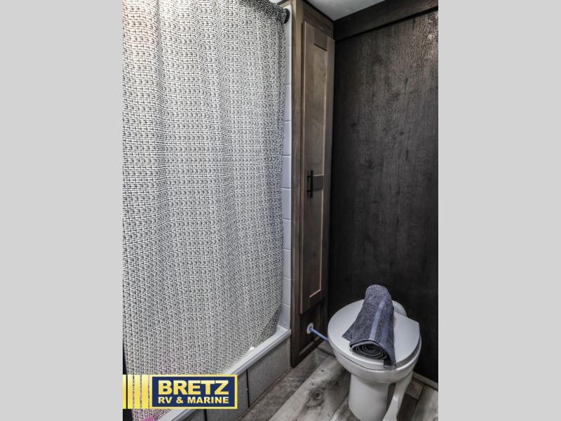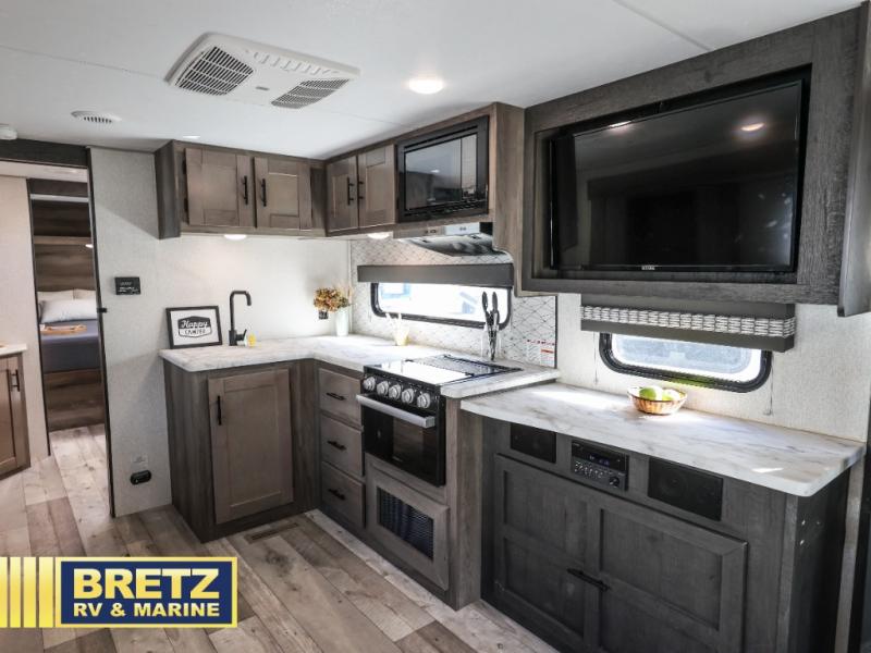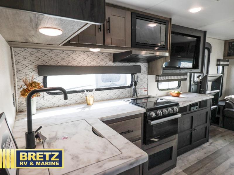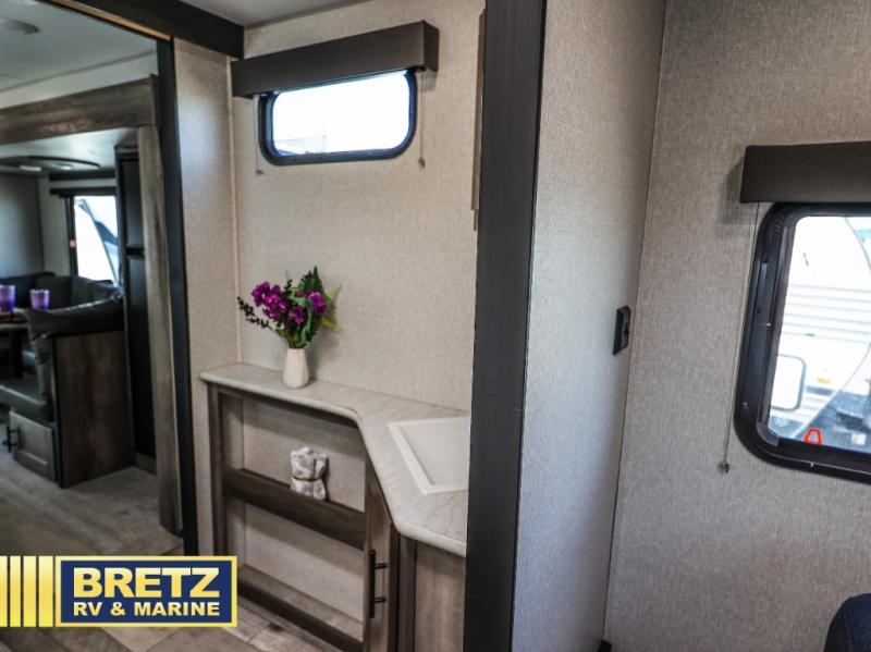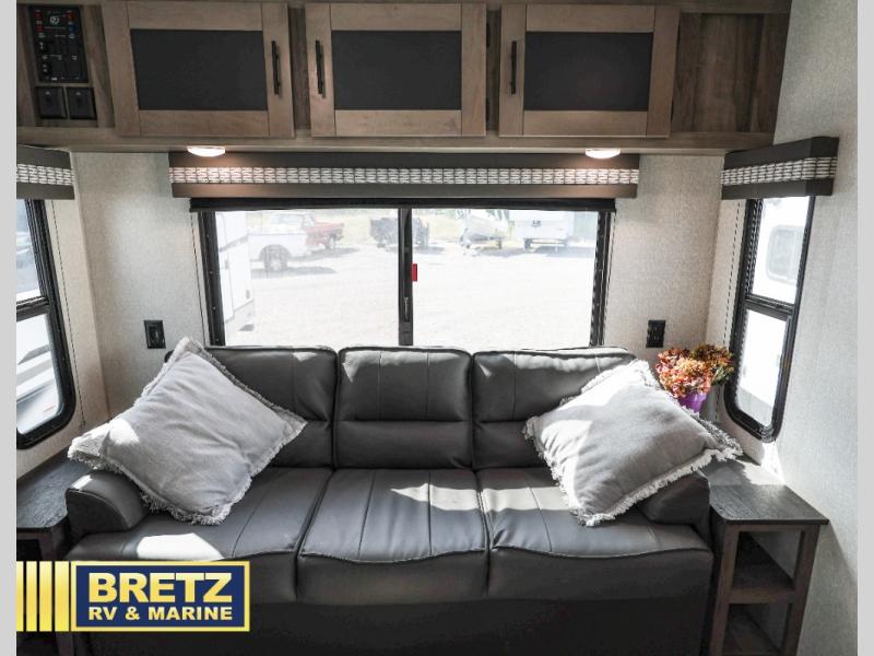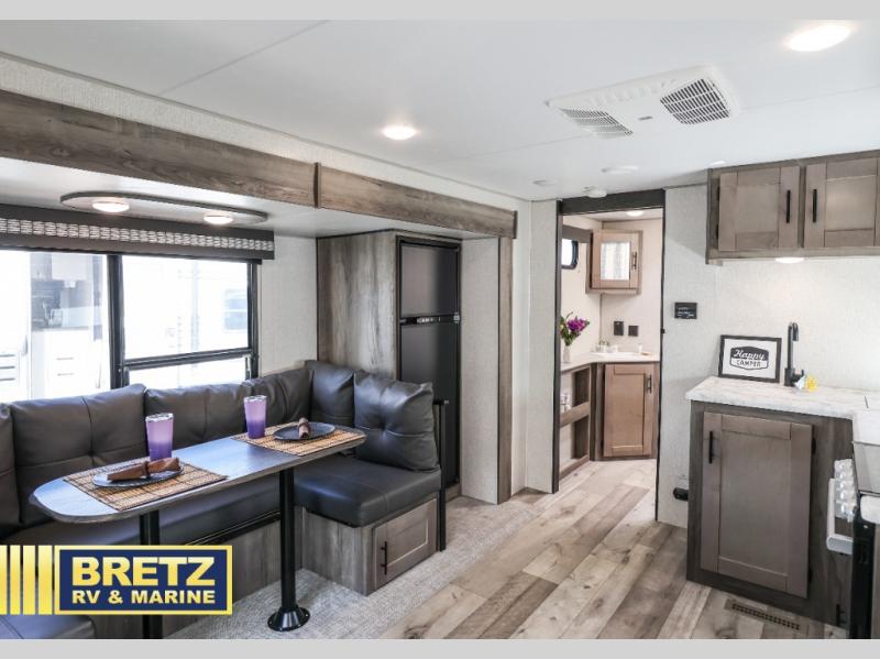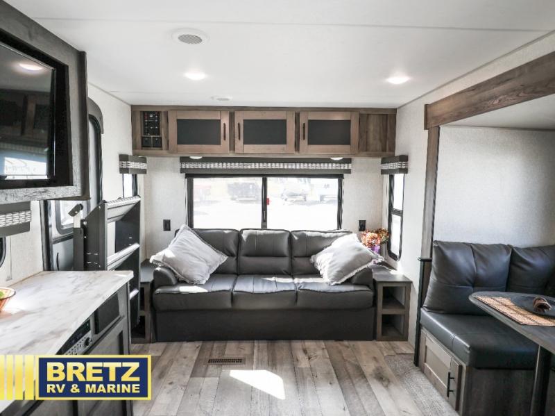 With dual entry doors, you will enjoy a smooth flow of traffic in and out of this travel trailer! There is a rear 70" sofa with end tables on either side to set your coffee on in the morning while you enjoy the multi-media entertainment center with a DVD player. Once the coffee has kicked in head to the 8 cu. ft. refrigerator for some eggs and bacon to fry up on the three burner drop-in cooktop with glass cover and oven, then enjoy them at the 80" U-shaped dinette which has 39" dinette storage bins to hold your games. Now that you're fueled up, you can head to the walk-through bathroom to freshen up in the 30" x 36" shower and get dressed in the front private bedroom!