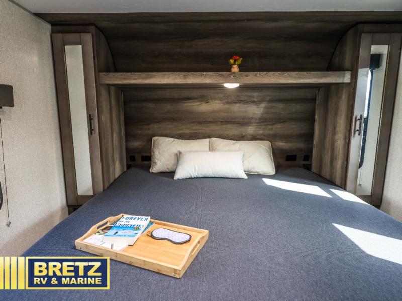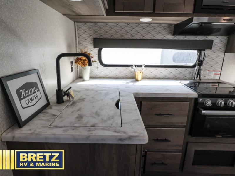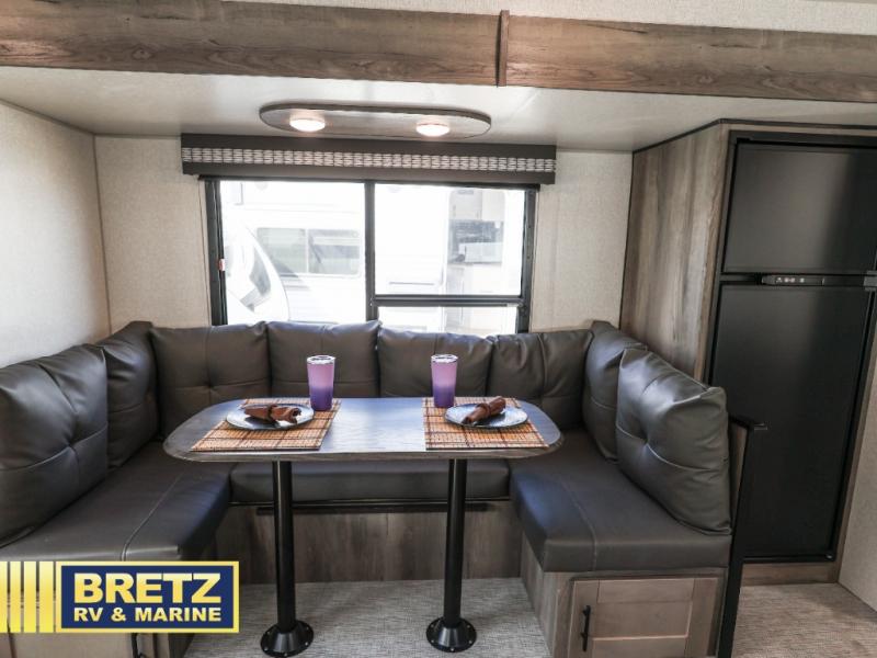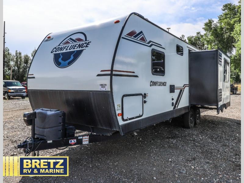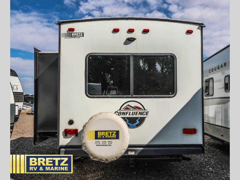 Each one of the KZ Confluence ultra lite travel trailers is constructed with a slide out for a more spacious and welcoming feeling! Life at the campsite will be easier with your furry friend too with the built-in dog dishes that can be neatly tucked away when not in use and the exterior leash latch with a bonus beverage opener. The Arctic package which is included with the mandatory Adventure and Comfort package has a fully enclosed, insulated and heated underbelly with 12V heat pads to keep the tanks and pipes protected through all weather and enclosed dump valves. The mandatory Peace of Mind package includes many convenient amenities, such as a power awning with an LED light strip, 39" dinette storage bins, upgraded linoleum, plus marine grade luxury woven vinyl flooring in the slide outs. Start a new adventure today in one of these Confluence travel trailers today!