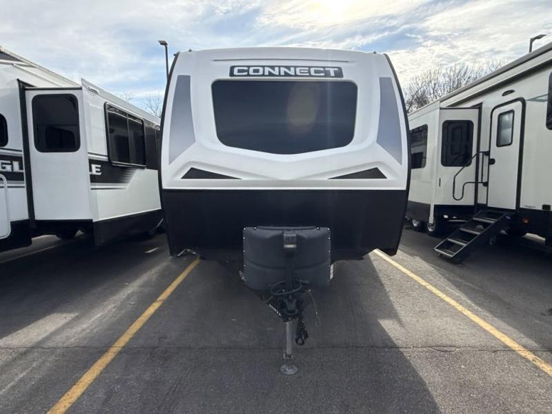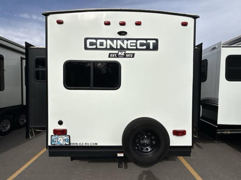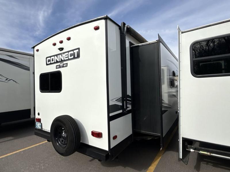 The KZ Connect travel trailer is a trailer with extreme style and creative floorplans! Wrapped up in a lightweight package, the Connect has gorgeous interior décor and a high-end fiberglass exterior. You will find a fiberglass front cap with front windshield, a power front jack, exterior speakers, a spare tire, Equa-Flex suspension, nitrogen-filled tires, a leash latch, and a heated, insulated, and enclosed underbelly, and that's just the beginning. There is still plenty more to check out, like the well-appointed interior that has a kitchen skylight, an HDMI/USB charging port, LED motion-sensor lights, an electric fireplace, and upgraded linoleum flooring.