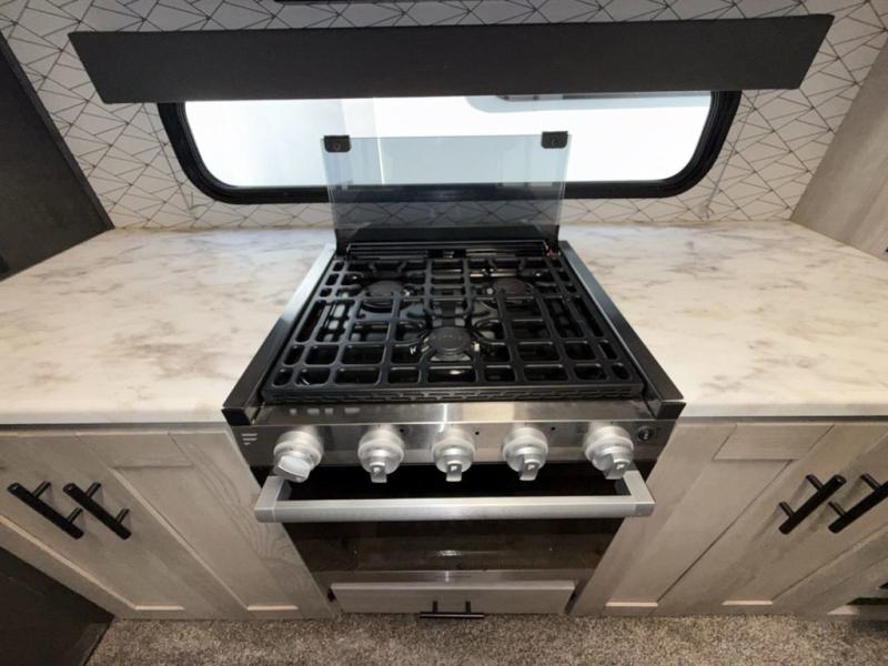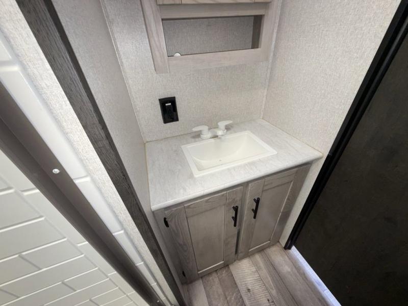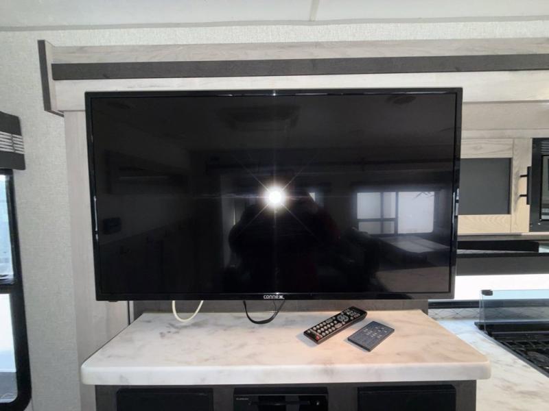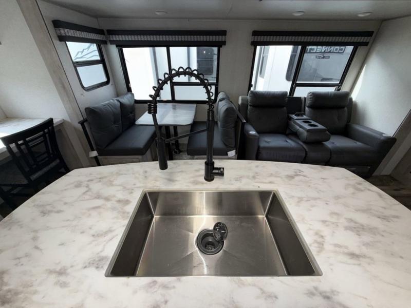 You are going to feel a very strong connection to this Connect travel trailer! With a king-size bed, ample living space, an indoor and outdoor kitchen, and an LED TV, what's not to love? Having a full bathroom is always a great convenience for any trailer, and this bathroom does not disappoint with its 30" x 36" shower, skylight, linen closet, and shelf with towel hooks. Another fun feature is the island in the kitchen. This gives you extra space to prep meals or clean up afterwards. If you have chosen to take your work with you on the road, then the desk with chair is going to be a very valuable feature for you, and since it is right in front of one of the rear windows, you can still see the beautiful outdoors while you work.