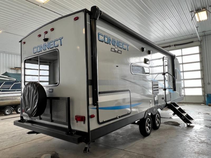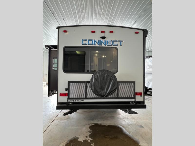 The KZ Connect travel trailer is a trailer with extreme style and creative floorplans! Wrapped up in a lightweight package, the Connect has gorgeous interior décor and a high-end fiberglass exterior. You will find a fiberglass front cap with front windshield, a power front jack, exterior speakers, a spare tire, Equa-Flex suspension, nitrogen-filled tires, a leash latch, and a heated, insulated, and enclosed underbelly, and that's just the beginning. There is still plenty more to check out, like the well-appointed interior that has a kitchen skylight, an HDMI/USB charging port, LED motion-sensor lights, an electric fireplace, and upgraded linoleum flooring.