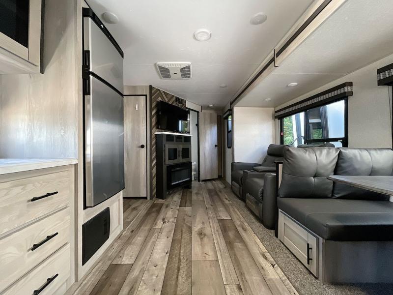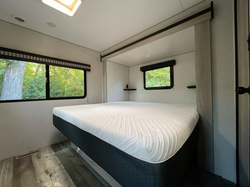 The KZ Connect travel trailer is a trailer with extreme style and creative floorplans! Wrapped up in a lightweight package, the Connect has gorgeous interior décor and a high-end fiberglass exterior. You will find a fiberglass front cap with front windshield, a power front jack, exterior speakers, a spare tire, Equa-Flex suspension, nitrogen-filled tires, a leash latch, and a heated, insulated, and enclosed underbelly, and that's just the beginning. There is still plenty more to check out, like the well-appointed interior that has a kitchen skylight, an HDMI/USB charging port, LED motion-sensor lights, an electric fireplace, and upgraded linoleum flooring.