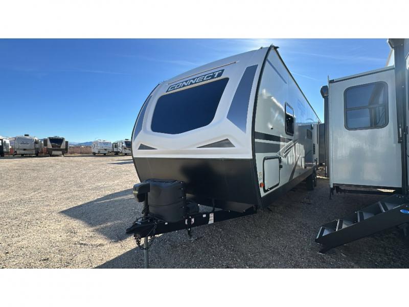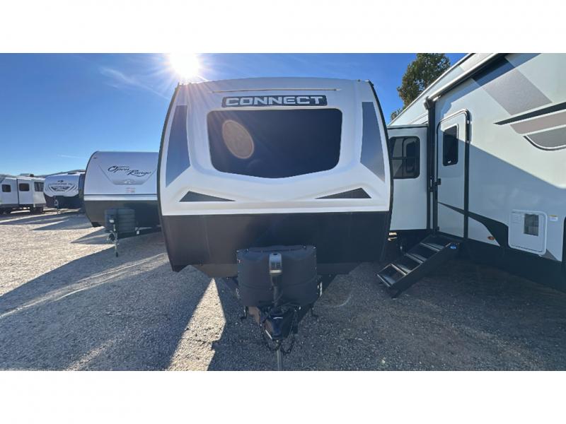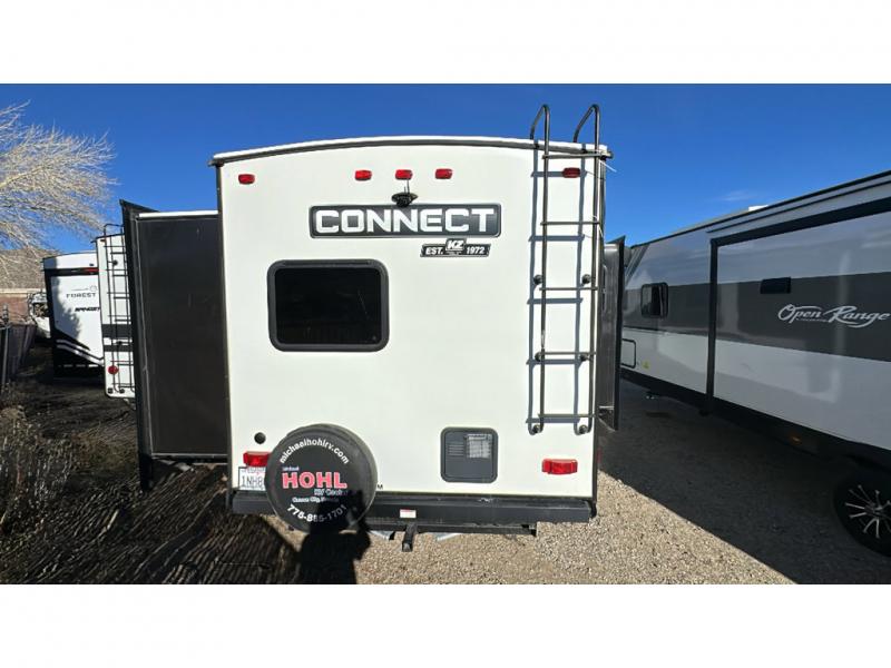 The KZ Connect travel trailer is a trailer with extreme style and creative floorplans! Wrapped up in a lightweight package, the Connect has gorgeous interior décor and a high-end fiberglass exterior. You will find a fiberglass front cap with front windshield, a power front jack, exterior speakers, a spare tire, Equa-Flex suspension, nitrogen-filled tires, a leash latch, and a heated, insulated, and enclosed underbelly, and that's just the beginning. There is still plenty more to check out, like the well-appointed interior that has a kitchen skylight, an HDMI/USB charging port, LED motion-sensor lights, an electric fireplace, and upgraded linoleum flooring.