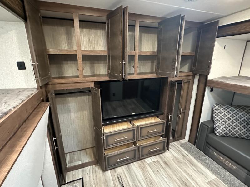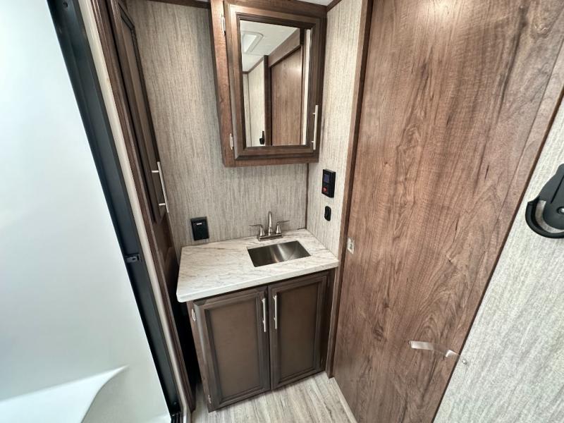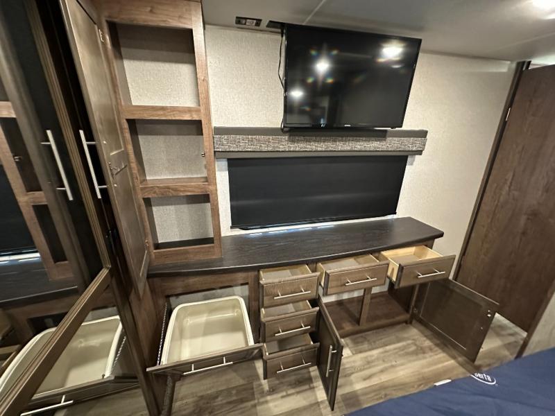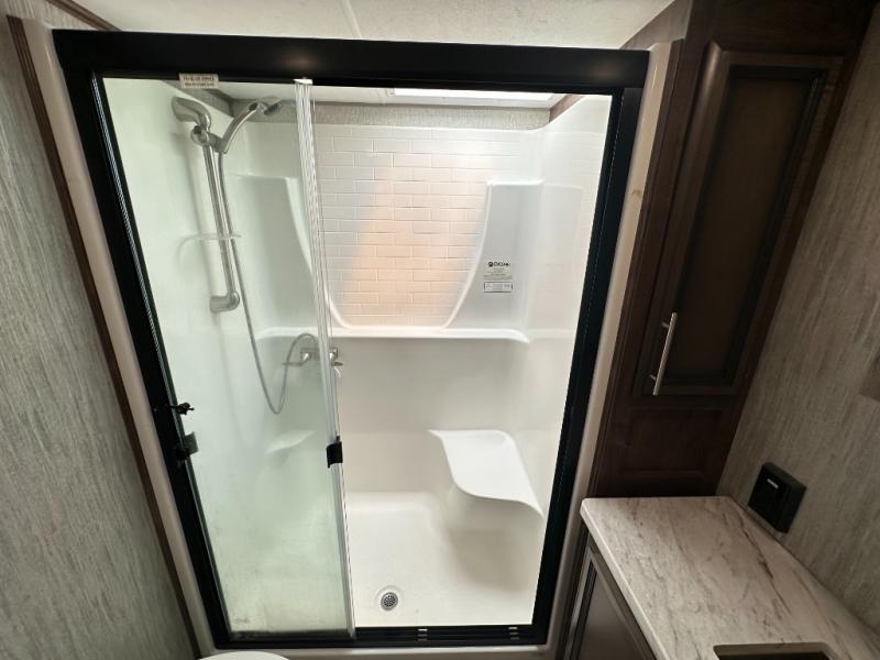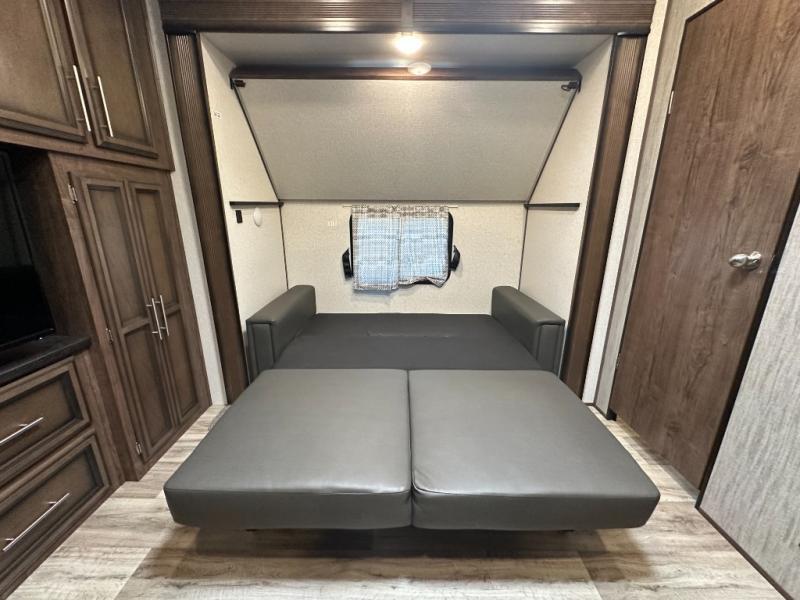 Convenience Pack: Auto leveling, 50A service with 2nd AC prep, power awning, backup camera prep, solar prep, tankless water heater, lithium-ready