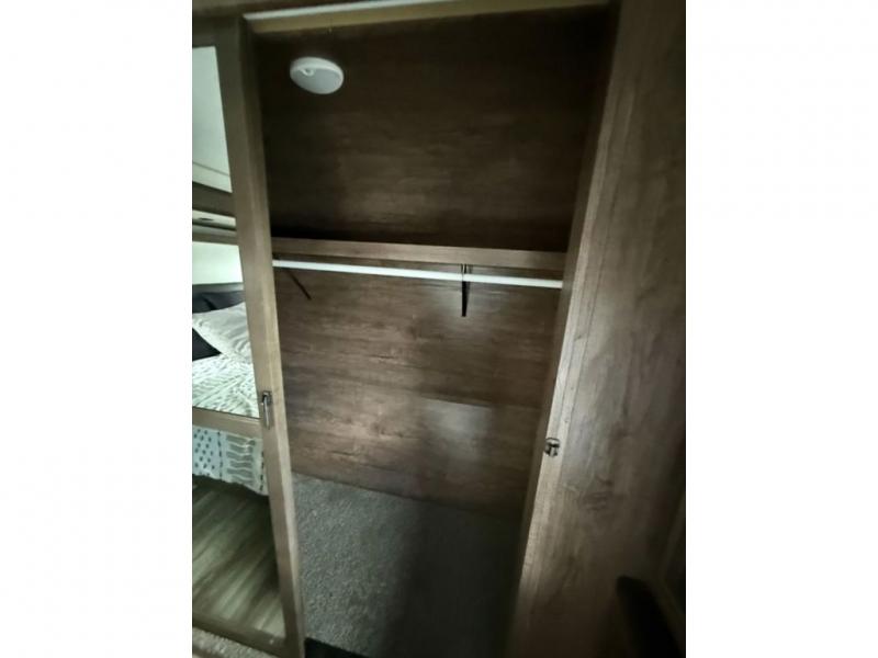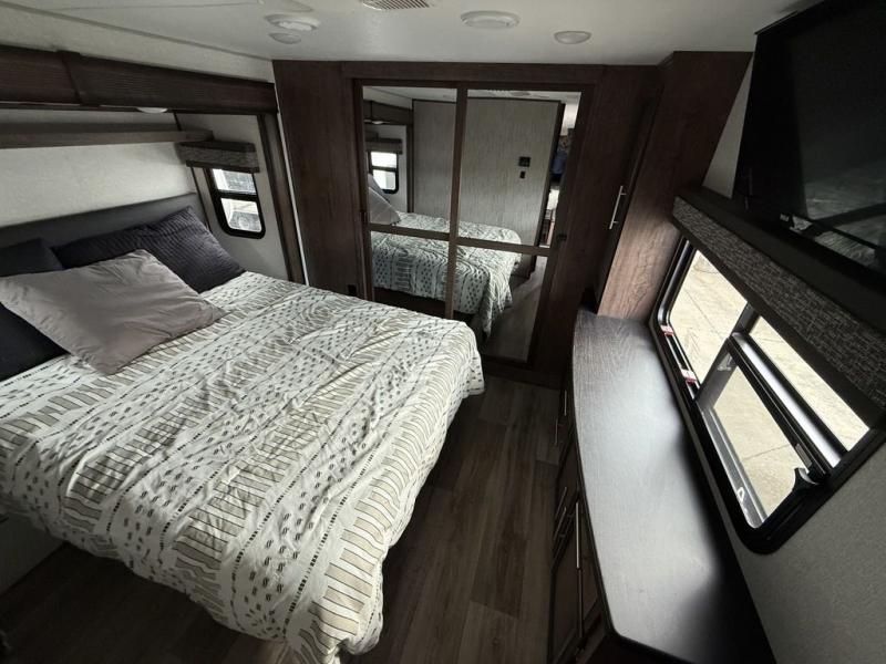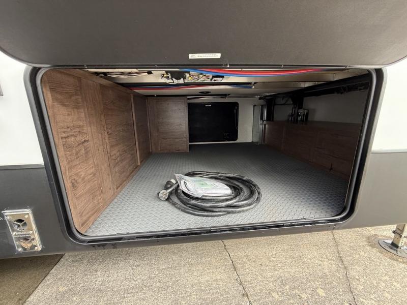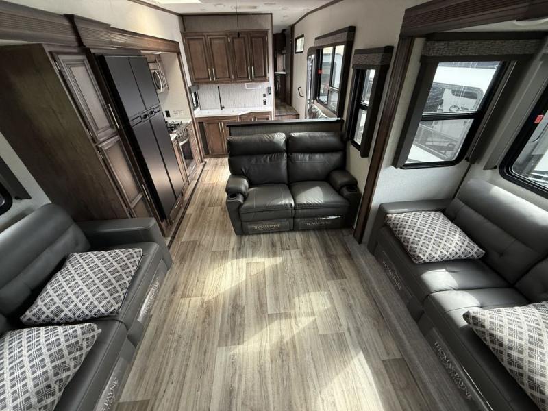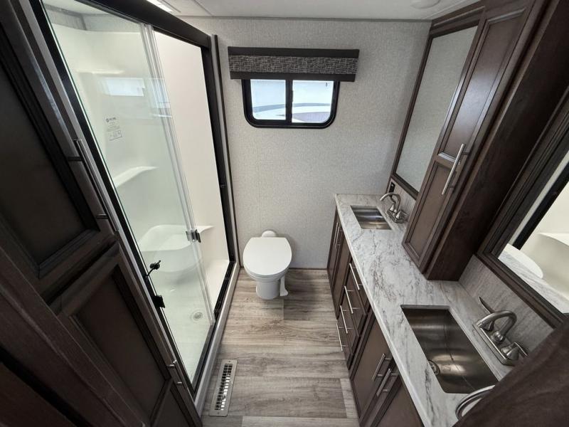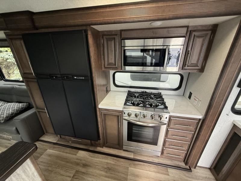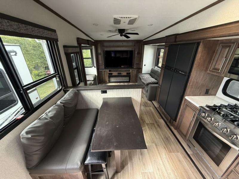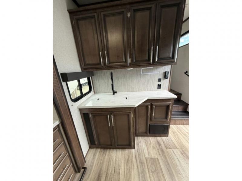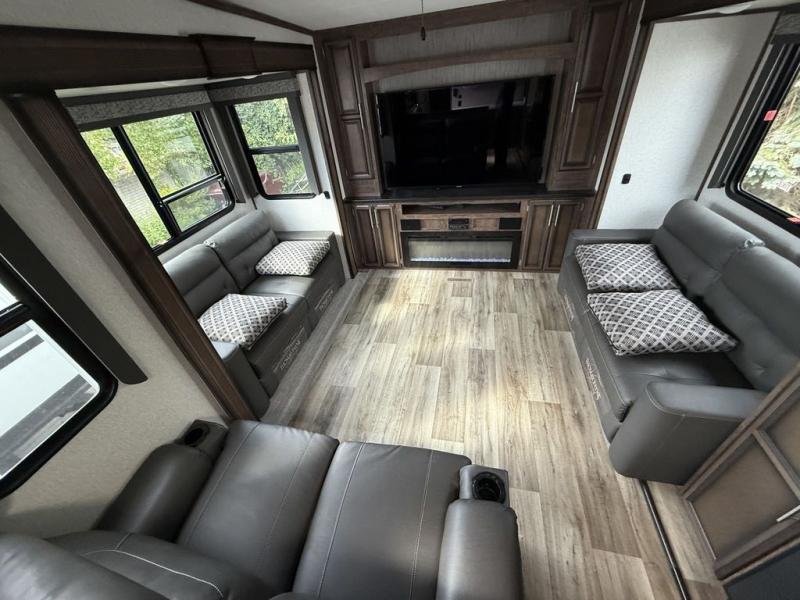 Whether you are a couple or a family this fifth wheel will provide everyone their own space to relax including somewhere to sleep at night for four or maybe more if some are willing to sleep on the theater seats or the booth seating. You will have your own king bed slide out giving you more floor space, and a wardrobe for clothing as well as a space to add a washer/dryer option to keep everything clean. There is a dresser as well with a built-in hamper. The full bathroom allows two people to be getting ready at once with dual sinks, and the pocket door gives you more space inside. The separate kitchen area allows the cook to make meals for two or more without interruptions and offers booth seating and two stools at the dinette. And everyone can enjoy the same show in the rear living area with a 65" TV, a cozy fireplace and plenty of seating for everyone.