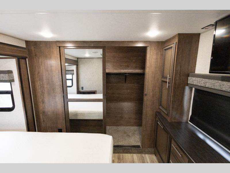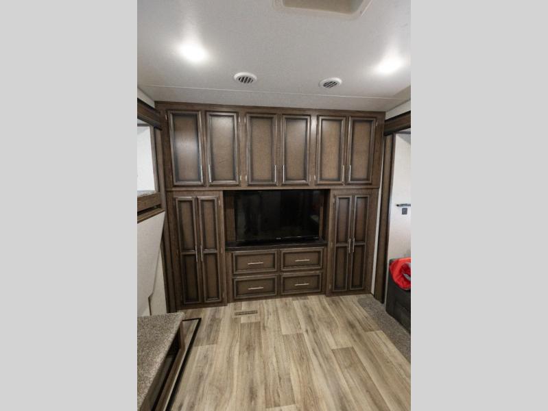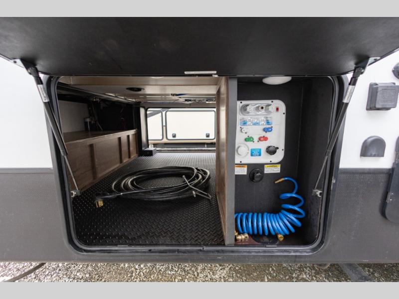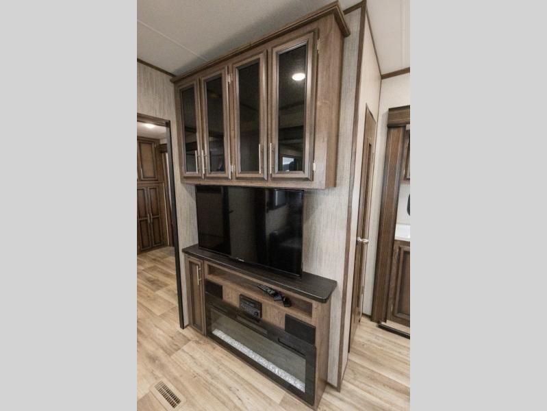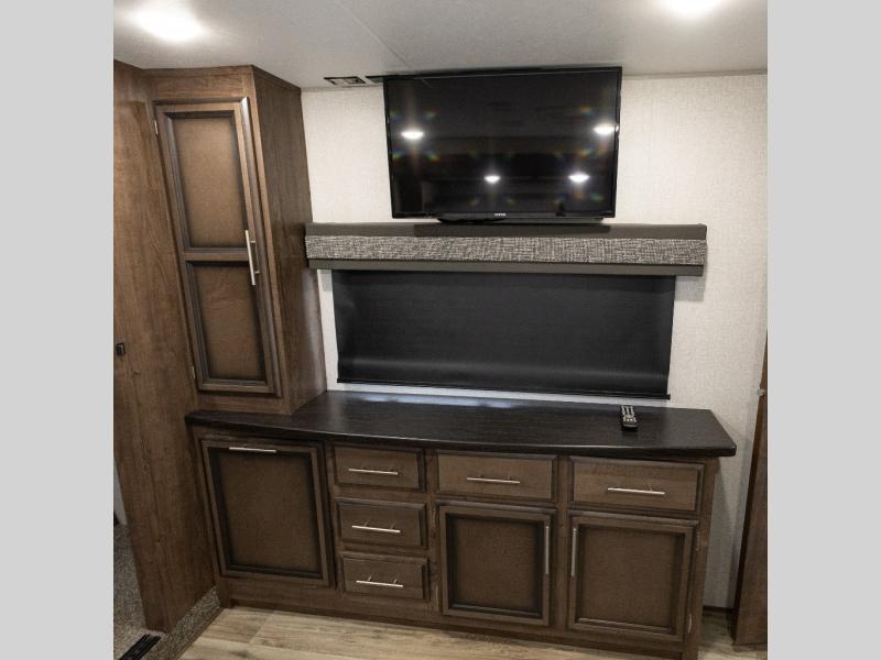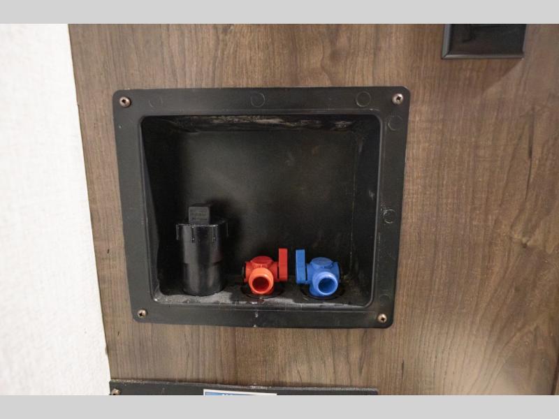 The kids or your guests will love having their own space in the private bunkhouse! They can enjoy a hide-a-bed sofa with a bunk above and two bunks on the opposite side, plenty of storage and an entertainment center, lots of floor space thanks to the dual opposing slides, and a half bath which is quiet handy at night. You will have your own king bed slide in the front bedroom on the opposite side of the RV. If you like to keep everything clean while camping, choose the washer and dryer option in the prepped space in the wardrobe, and the handy built-in hamper in the dresser is near by. The cook will have a full kitchen to make meals including a 12 cu. ft. refrigerator, and the choice to cook outdoors on the outside kitchen. You will also be able to tow with the hitch receiver, walk up the flip-up solid steps with ease, and sit under the 16' power awning when you would like some outdoor living space.
