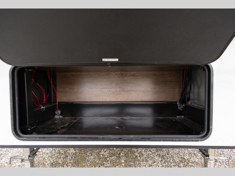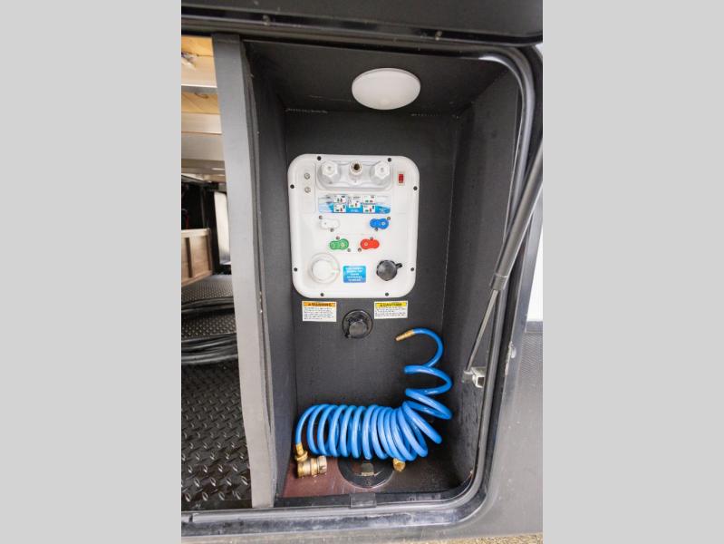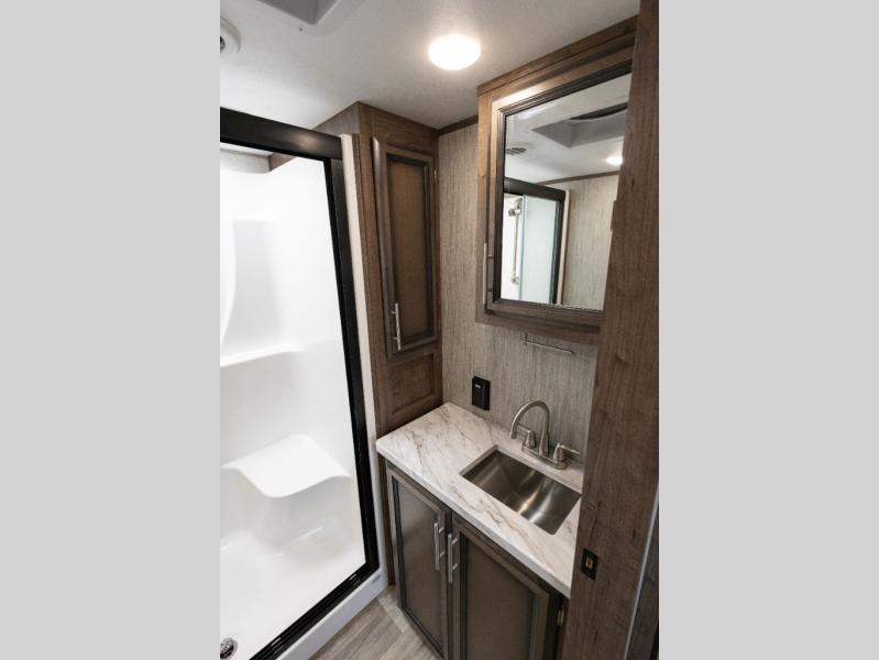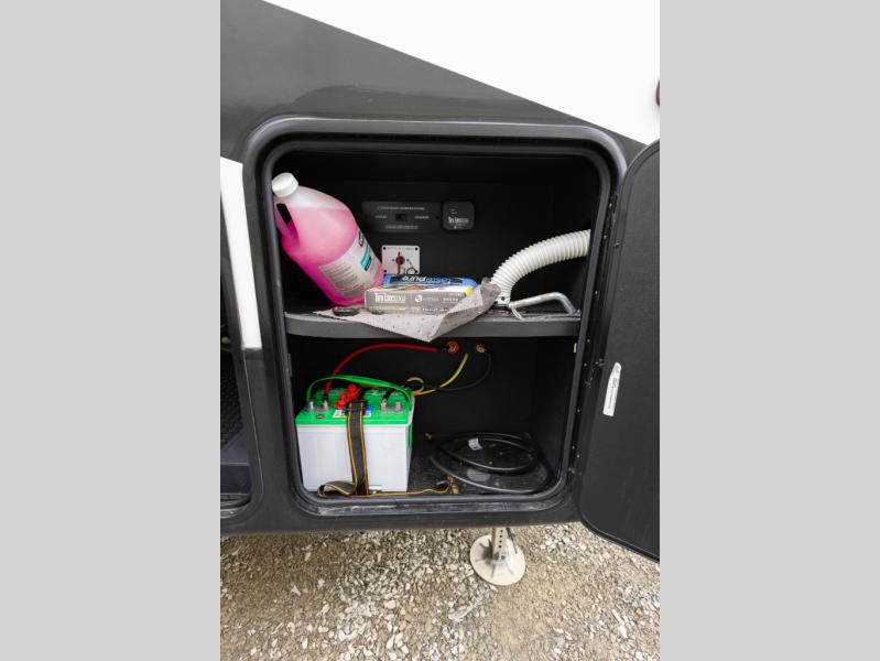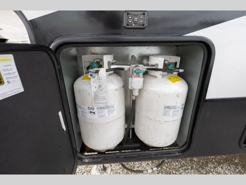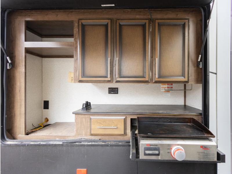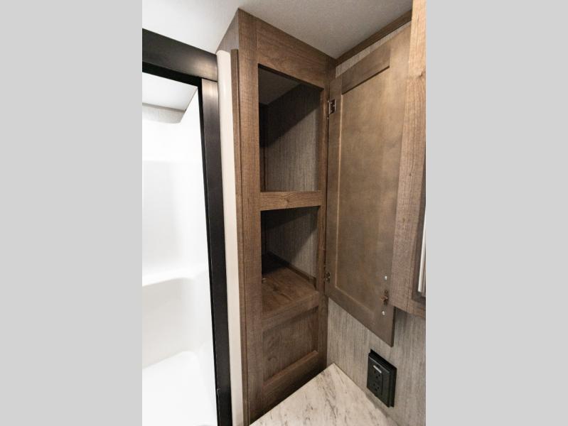 The kids or your guests will love having their own space in the private bunkhouse! They can enjoy a hide-a-bed sofa with a bunk above and two bunks on the opposite side, plenty of storage and an entertainment center, lots of floor space thanks to the dual opposing slides, and a half bath which is quiet handy at night. You will have your own king bed slide in the front bedroom on the opposite side of the RV. If you like to keep everything clean while camping, choose the washer and dryer option in the prepped space in the wardrobe, and the handy built-in hamper in the dresser is near by. The cook will have a full kitchen to make meals including a 12 cu. ft. refrigerator, and the choice to cook outdoors on the outside kitchen. You will also be able to tow with the hitch receiver, walk up the flip-up solid steps with ease, and sit under the 16' power awning when you would like some outdoor living space.