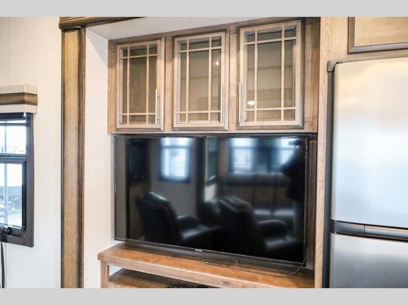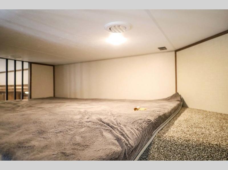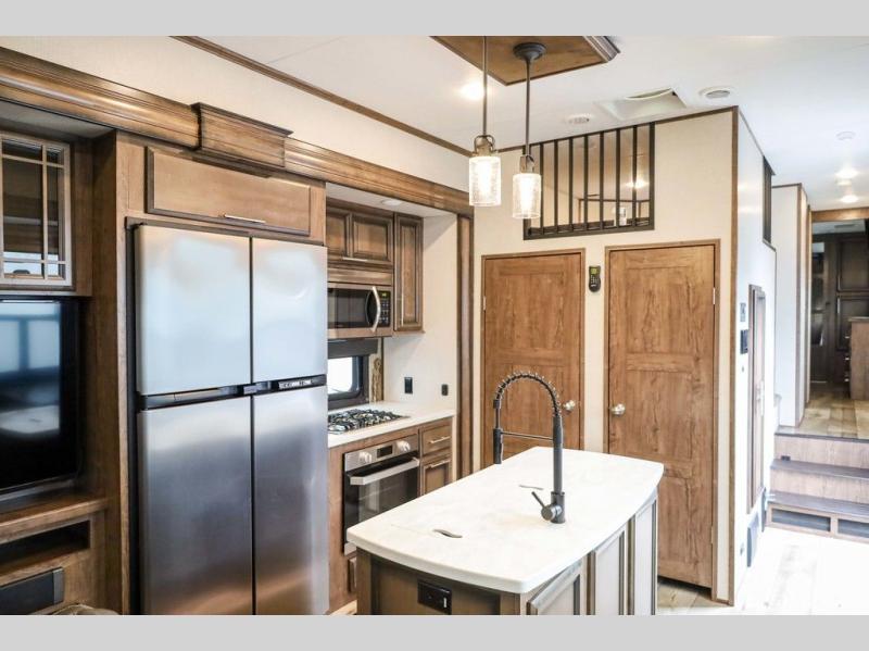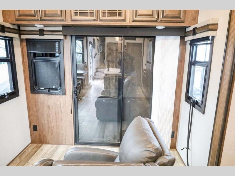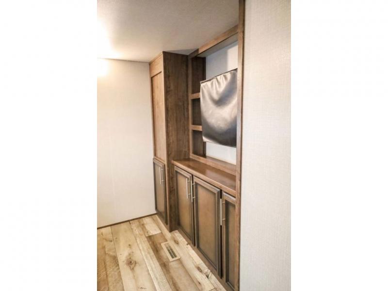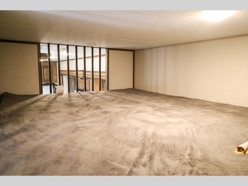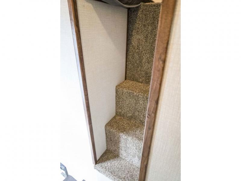 You will enjoy living or camping in this fifth wheel with the choice to hangout outside above ground on the rear patio deck with a patio door for easy access plus you can use some of the space to store your outdoor gear like fishing pools, wet boots, and such. The 19' power awning by the main entry also offers an outdoor living area protected from the elements and you might choose to add a second awning option. The cook will enjoy making food for everyone with all the appliances and floor space plus the stainless steel dishwasher will help with clean up. The extra room is accessed through the kitchen and can be utilized as an office with the desk top, a second living area and/or a second bedroom thanks to the hide-a-bed sofa. The queen-size loft above has stairs with access in the hallway so the kids can easily get to the loft to sleep or play, and it is near the full bathroom. The front master bedroom will surely not disappoint each time you enter thanks to electric-tilt king bed and all the storage for your clothing, plus there is a space prepped for a washer/dryer option and more handy storage.