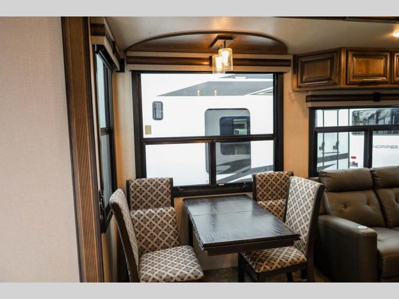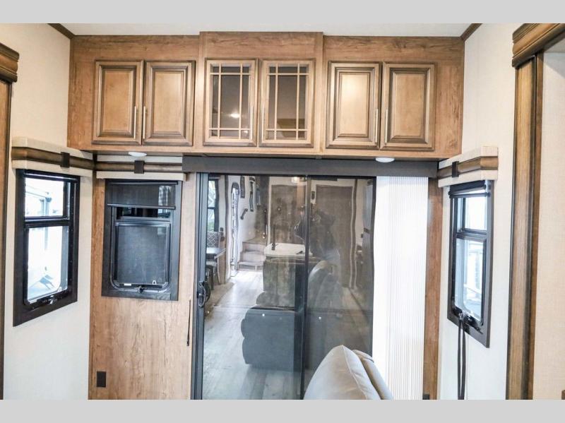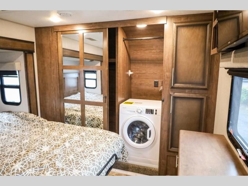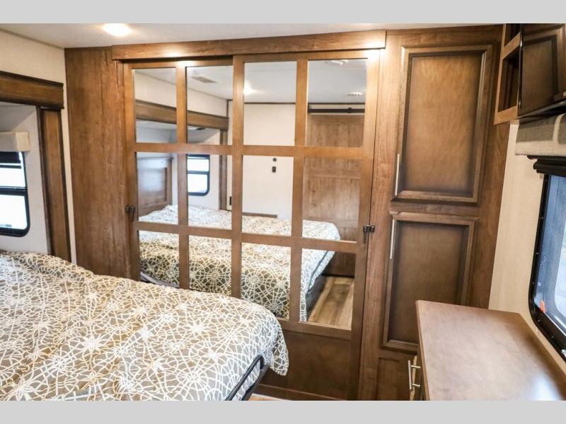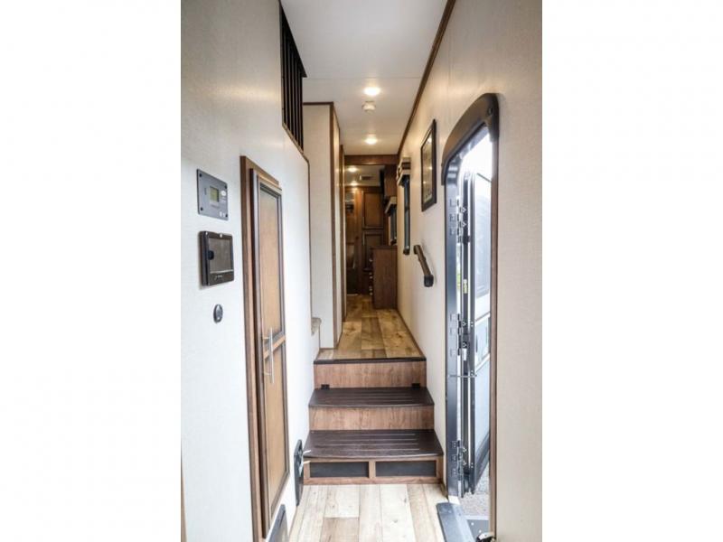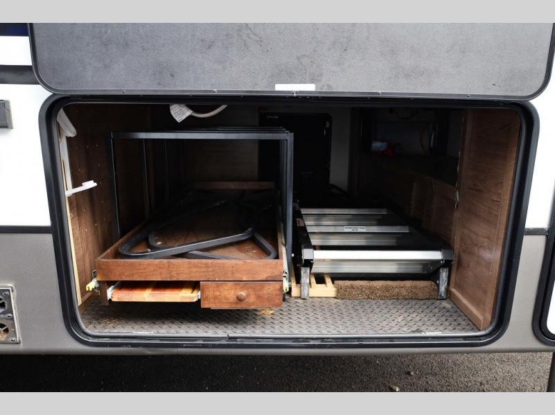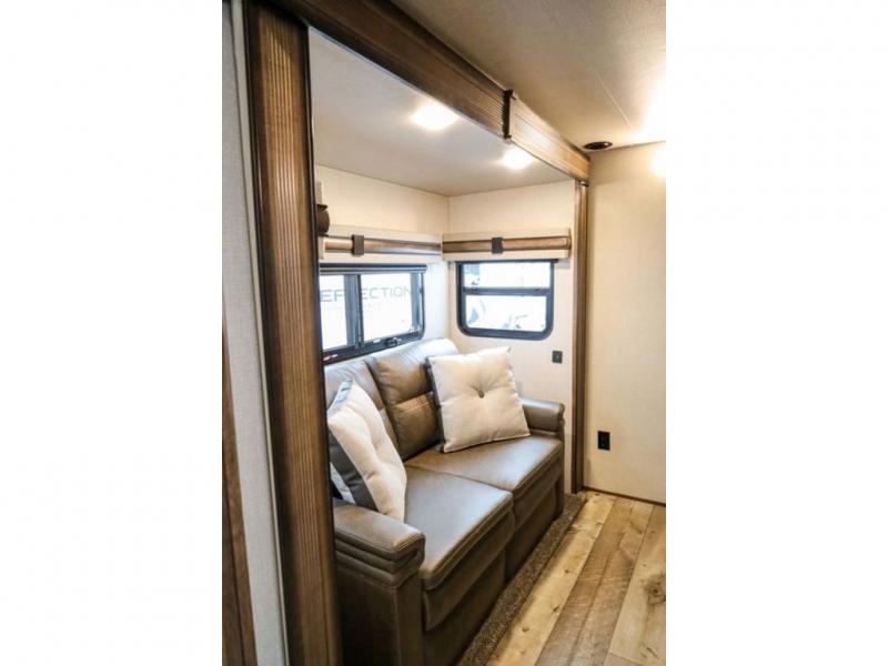 You will enjoy living or camping in this fifth wheel with the choice to hangout outside above ground on the rear patio deck with a patio door for easy access plus you can use some of the space to store your outdoor gear like fishing pools, wet boots, and such. The 19' power awning by the main entry also offers an outdoor living area protected from the elements and you might choose to add a second awning option. The cook will enjoy making food for everyone with all the appliances and floor space plus the stainless steel dishwasher will help with clean up. The extra room is accessed through the kitchen and can be utilized as an office with the desk top, a second living area and/or a second bedroom thanks to the hide-a-bed sofa. The queen-size loft above has stairs with access in the hallway so the kids can easily get to the loft to sleep or play, and it is near the full bathroom. The front master bedroom will surely not disappoint each time you enter thanks to electric-tilt king bed and all the storage for your clothing, plus there is a space prepped for a washer/dryer option and more handy storage.