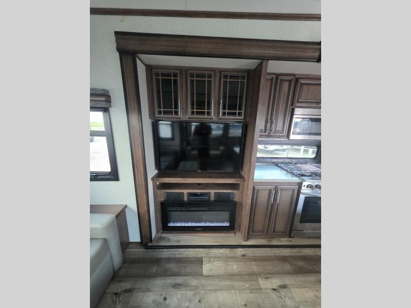 The spacious front master bedroom will excite you with its two slide outs offering lots of space to walk around the electric-tilt king bed to get to the front wall wardrobe, the closet with built-in hamper, the dresser with hidden storage and the closet next to the bed. You also have access to the double entry bathroom. Inside, you will find a shower with a seat, linen storage and a dual sink vanity to quickly get ready for the day. Cooking is made easy with a four-burner range, 24" oven and a convection microwave, plus the kitchen island offers extra counter space to serve meals. There is a closet prepped for a washer/dryer option, a pantry for all your goodies, and a fireplace to keep you cozy while sitting on the hide-a-bed sofa or theater seats, plus there are two more slides giving you plenty of walking around room to entertain and stretch out. And there are more options to choose from to customize your RV just like you want, take a look!