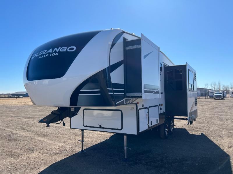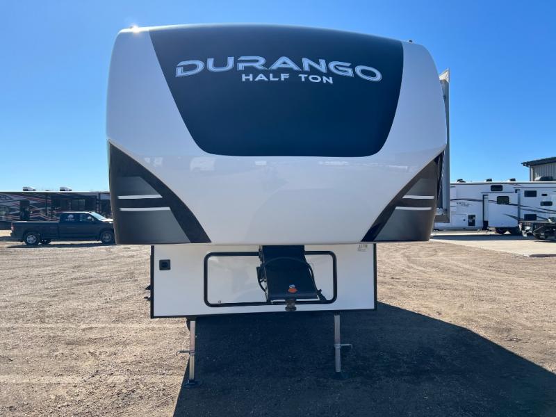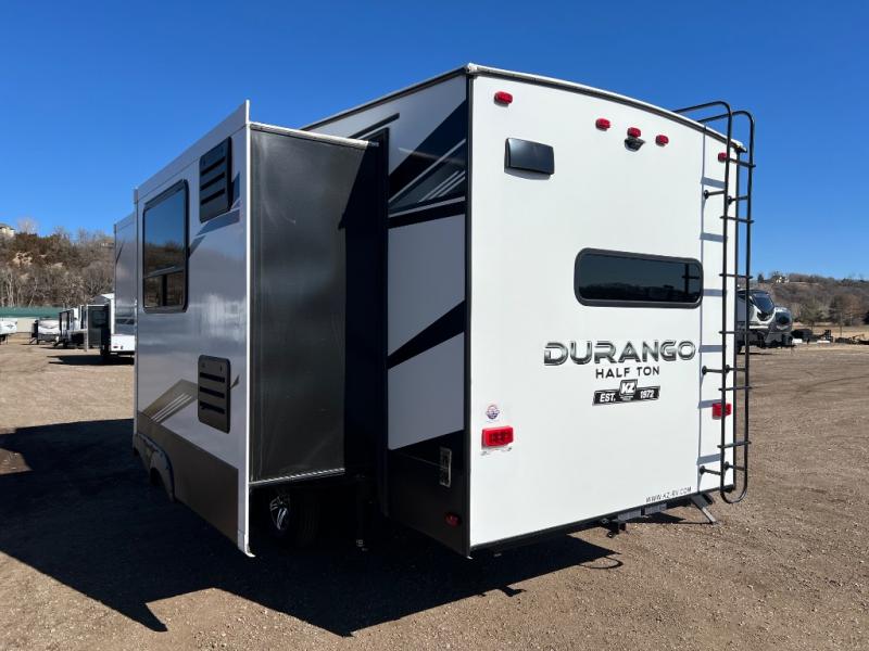 This Durango Half-Ton fifth wheel gives you a great space to spend your time in! There is a rear kitchen so that you can get to cooking as soon as you enter the trailer, and the single slide holds the 8-cubic foot refrigerator and hide-a-bed sofa so that you have more room to work in the kitchen. The pantry is right next to the booth dinette, and the entertainment center with LED TV sits right behind the dinette so that you can view it easily from the sofa. Head into the full bathroom if you need to freshen up and enjoy the extra sunshine streaming in through the shower skylight. If you want to take a nap, just walk into the private bedroom and lie down on the queen-size bed.