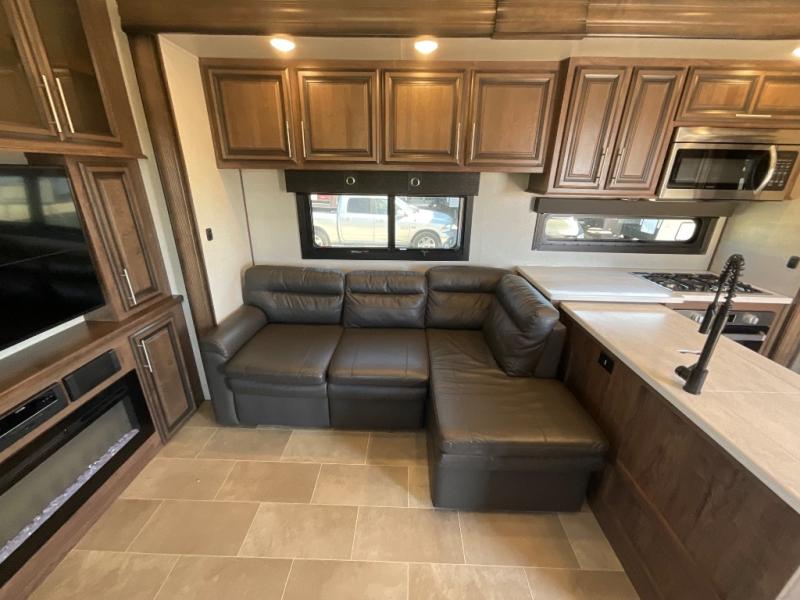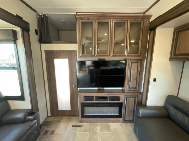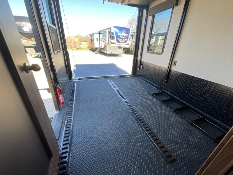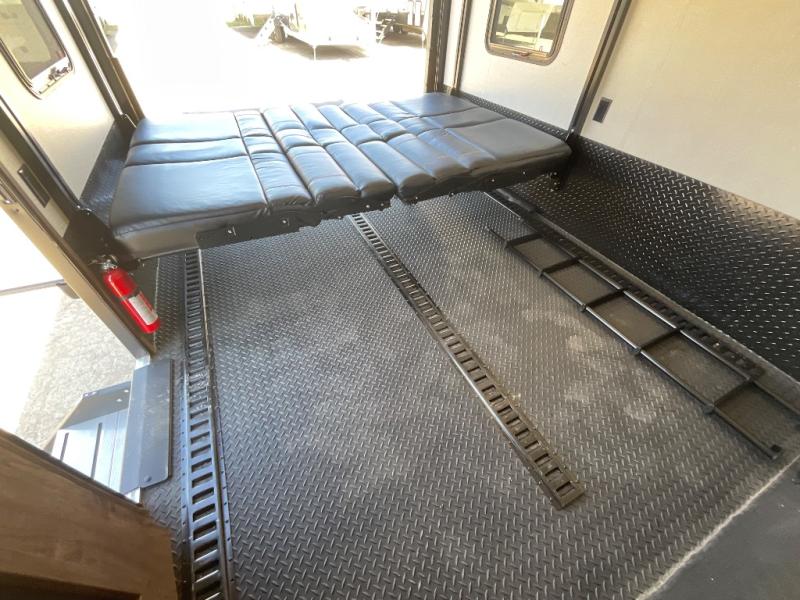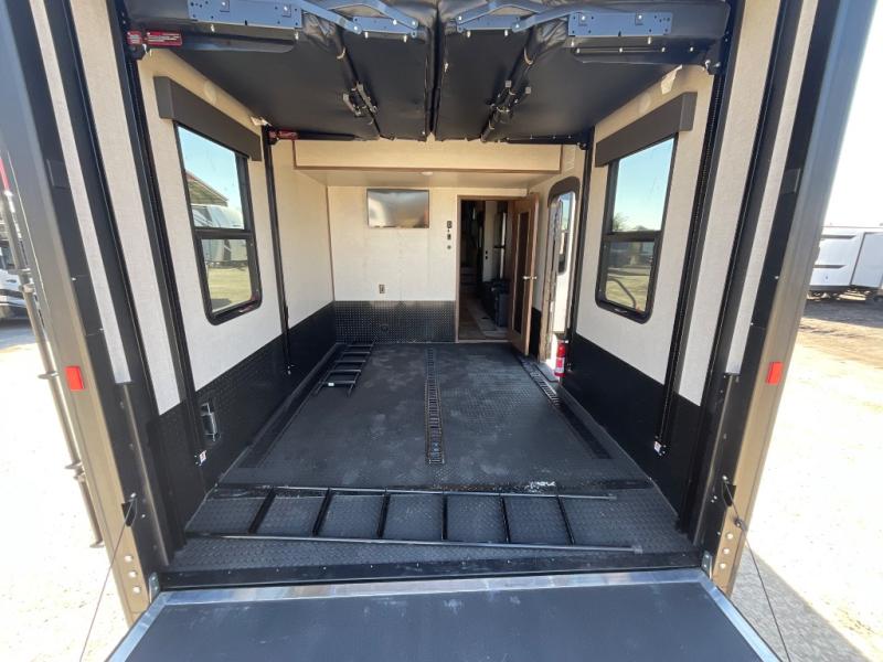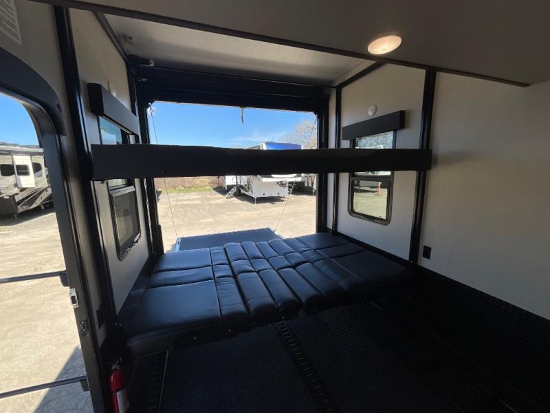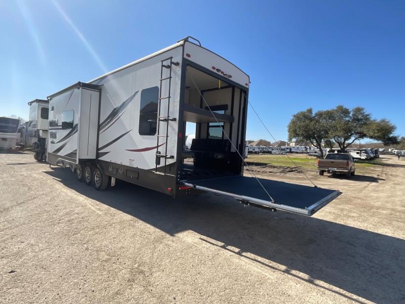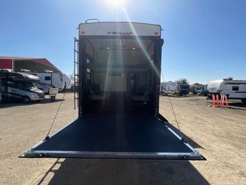 Step into luxury with this toy hauler! Your crew can relax comfortably in the main living area with dual opposing slides, theater seating, plus a 65" LED TV with a 40" fireplace! Whip up your best meals on the 24" four burner oven, and you can store your dishes in the hutch. The little ones can use the ladder to access the 40" x 96" loft bed, and if you're needing a rest, the slide out electric tilt king bed in the front bedroom is sure to bring comfort. There is also a sleeper sofa for additional sleeping space, plus you can add the optional power bed in the garage. After a day of riding the trails you can get cleaned up in the full bath that features a residential shower with a seat, and a linen closet for clean towels. This model also includes flip-up Solid Steps outside, as well as a pass-through storage for your riding gear, and a 17' power awning with LED lights to relax in the evening!