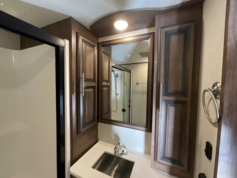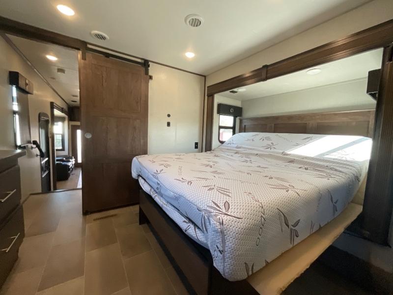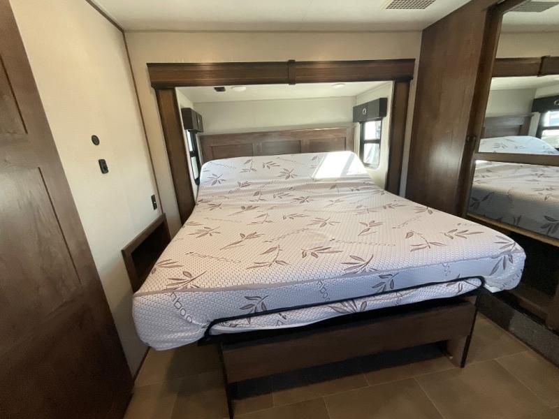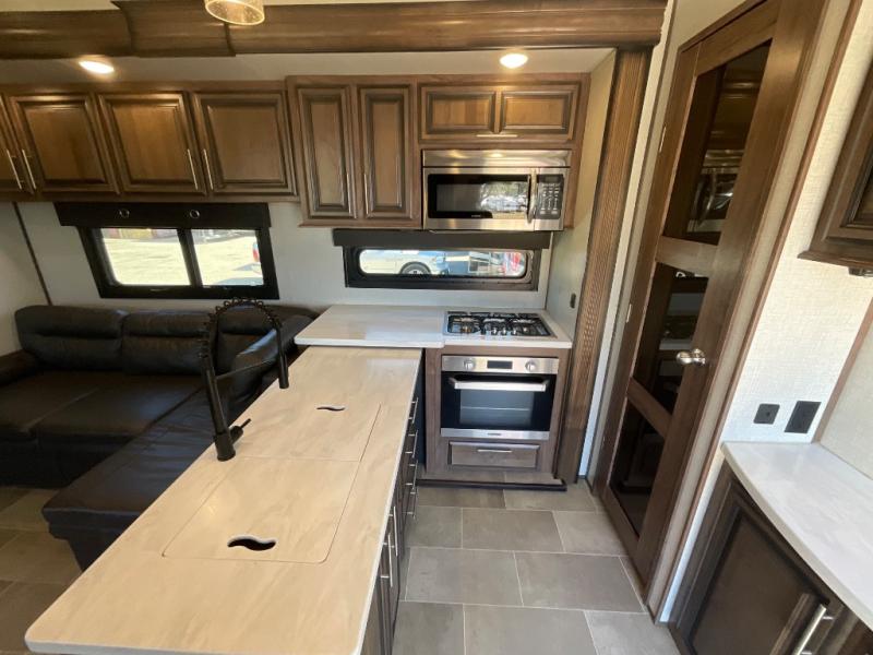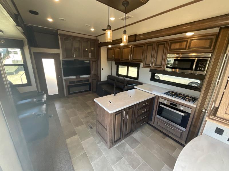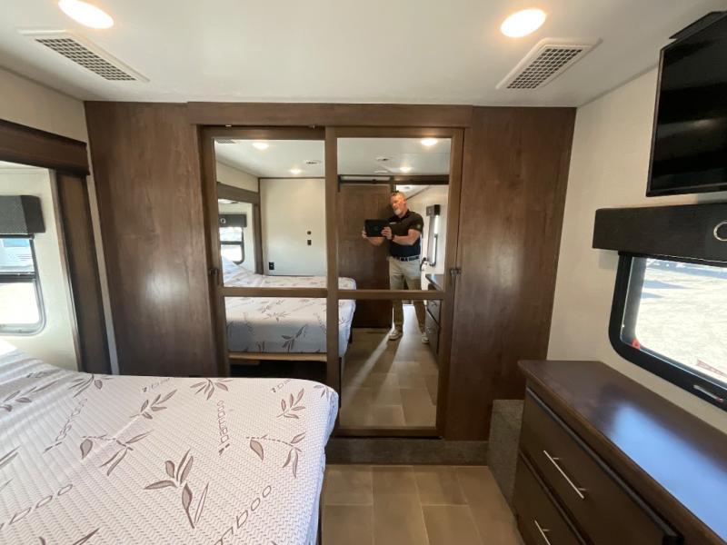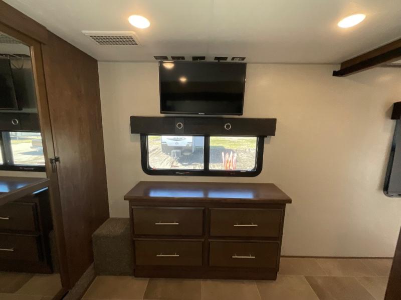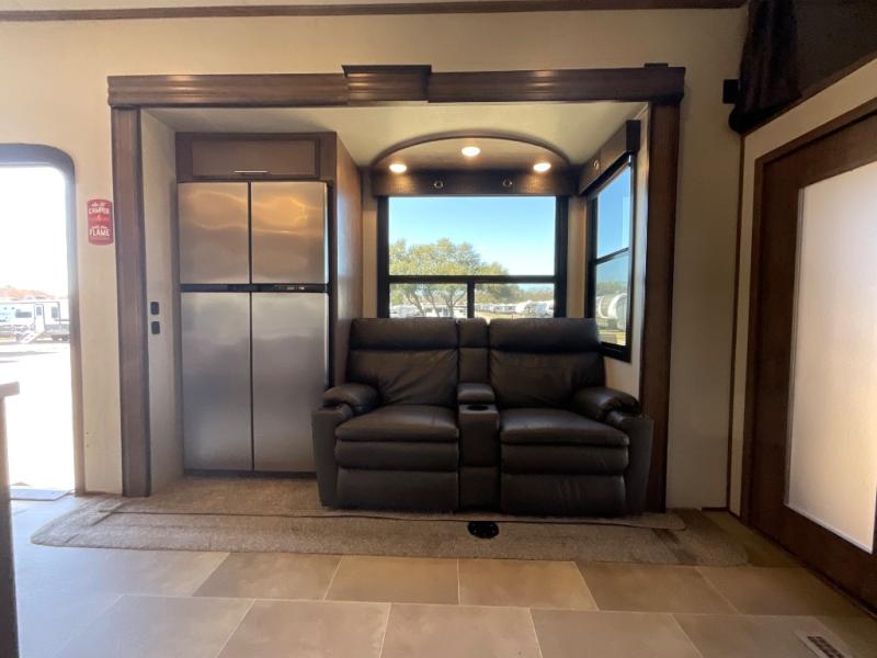 Step into luxury with this toy hauler! Your crew can relax comfortably in the main living area with dual opposing slides, theater seating, plus a 65" LED TV with a 40" fireplace! Whip up your best meals on the 24" four burner oven, and you can store your dishes in the hutch. The little ones can use the ladder to access the 40" x 96" loft bed, and if you're needing a rest, the slide out electric tilt king bed in the front bedroom is sure to bring comfort. There is also a sleeper sofa for additional sleeping space, plus you can add the optional power bed in the garage. After a day of riding the trails you can get cleaned up in the full bath that features a residential shower with a seat, and a linen closet for clean towels. This model also includes flip-up Solid Steps outside, as well as a pass-through storage for your riding gear, and a 17' power awning with LED lights to relax in the evening!