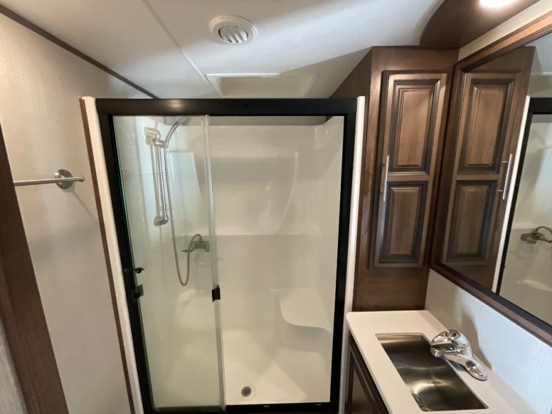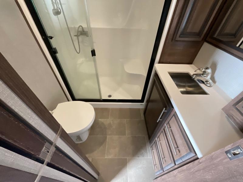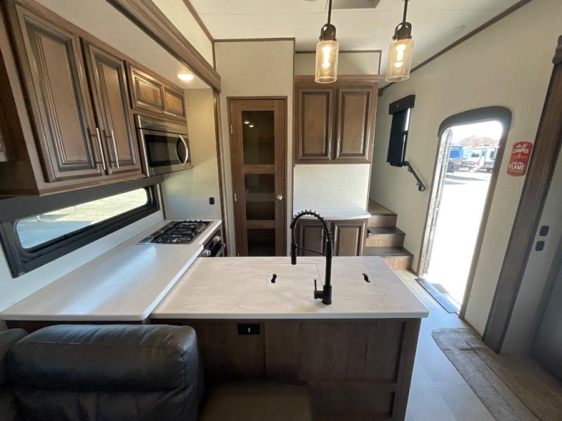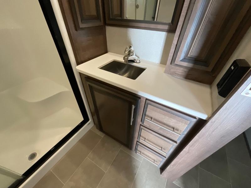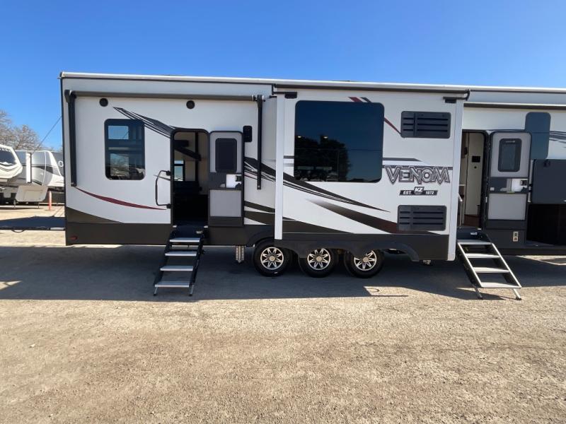 With any Venom toy hauler fifth wheel by KZ you can make memories for years to come since these models are constructed with quality materials, such as Tufflex roofing material, an extra reinforced heavy-duty front fiberglass cap, and a 6-sided aluminum frame. The fully vented attic allows for unwanted moisture to escape easily, and each model includes the All Weather Insulation Package with a heated, insulated, and enclosed underbelly. Add that with the 35,00 BTU furnace and the three Whisper Quiet 15,000 BTU A/C units, and you'll be camping all year around! The garage has been constructed with your adventures in mind with its E-Track tie-down system, built-in dovetail, and a Zero Gravity ramp door with easy-lift assist. Inside, you will enjoy luxury woven vinyl flooring in the slide outs, maple glazed cabinetry, a central vacuum system with attachments, solid surface countertops, plus so much more! You can further customize your Venom toy hauler with one of the many options available, including the Lithium-ready charging station, the "Off The Grid" solar package, and the three seasons patio door in place of the screen wall!