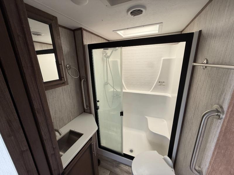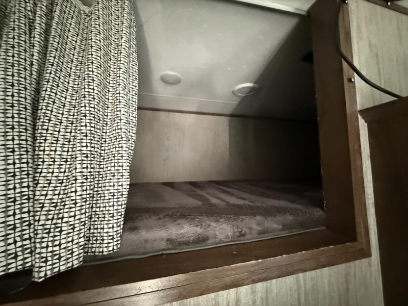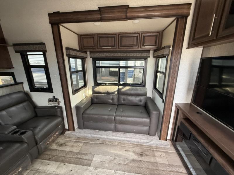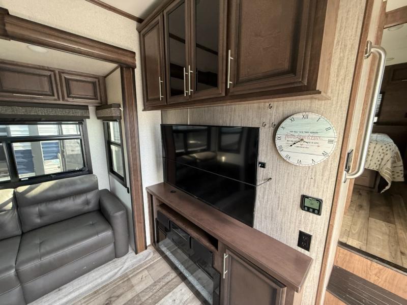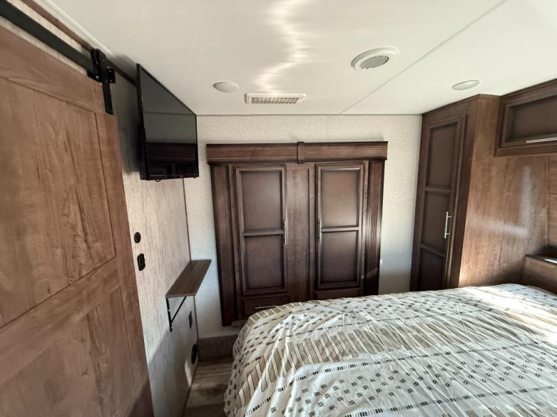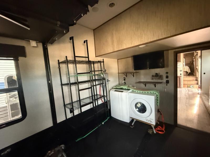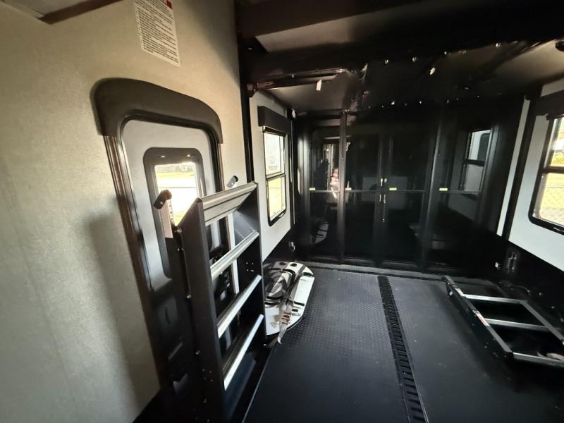 Who says you can't kick up some mud during the day, and relax in luxury at night?! This toy hauler allows you to do just that with its 13' separate garage for your dirt bikes, and many interior comforts to make you feel right at home. The kids will love the loft bed, and if you need more sleeping space, just choose the optional power bed with Sit & Sleep sofas. The chef of the group can prepare meals on the 24" four burner oven, or use the convection microwave above the range. Easily store perishables in the 18 cu. ft. gas/electric refrigerator, and snacks can go in the pantry. This model features dual opposing slides in the main living area, a 65" LED TV, plus a 40" fireplace for the perfect hang-out spot after dinner. The full bath includes a residential shower with a seat for your comfort, and you and your spouse are sure to love the front private bedroom. Here, the electric tilt king bed can be switched out for an optional queen bed if you're wanting more floor space, and there is a wardrobe slide out for all your clothes.