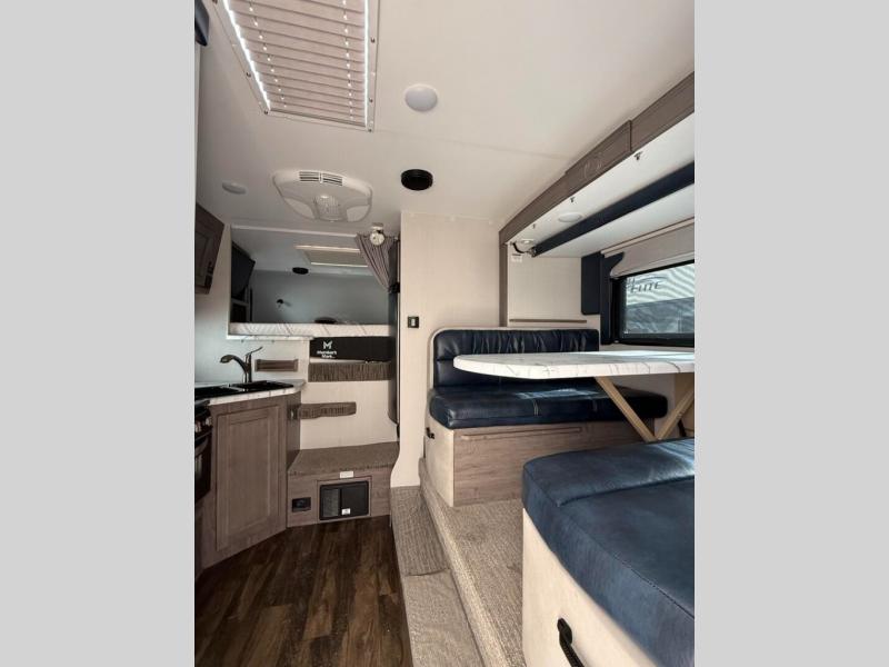 Even though this Lance truck camper is compact enough to fit in a short-bed truck, it provides all of the features and amenities seen in larger models. The single slide booth dinette that has been included is what gives this camper the ability to sleep four people each evening, and in the morning you can feast on a hearty breakfast cooked up in the fully equipped kitchen on the stainless steel three-burner range top and stored for later in the 5 cubic foot three-way refrigerator. You will experience privacy throughout your trip with the mini blinds above the dinette, the galley, and the cab-over, plus there is a privacy curtain for you to draw when you're ready to lay down on the queen-size pillow top mattress.