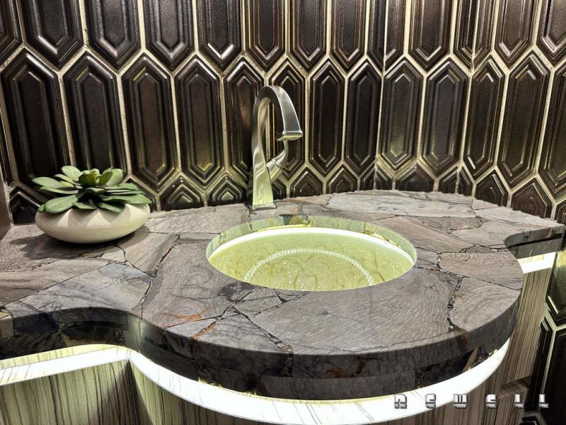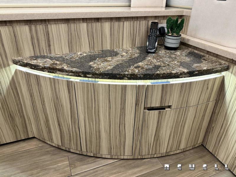 Cambria Harlech reveal lit countertop w/ waterfall edge at galleyExpandable dinette with quartz top