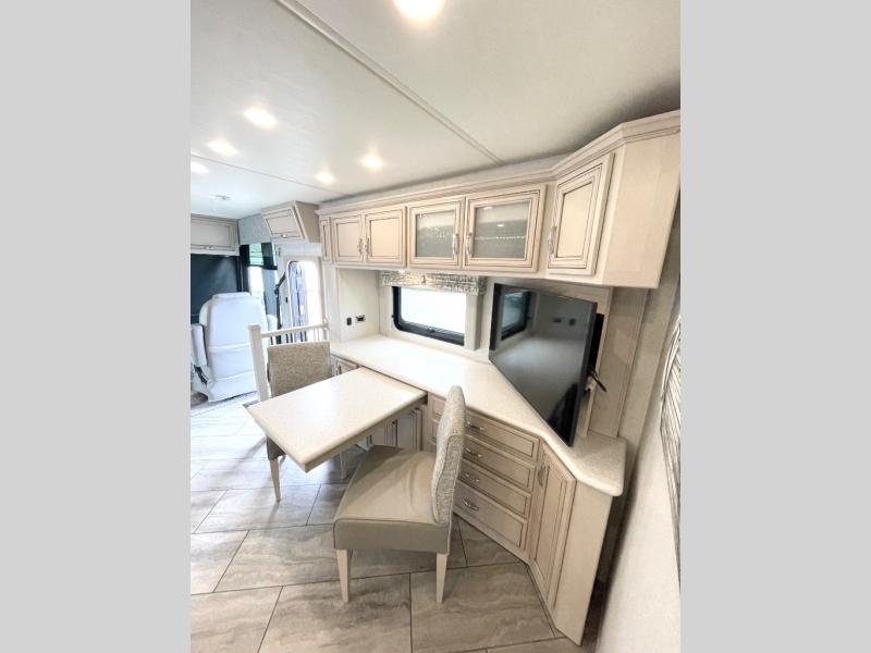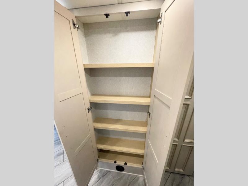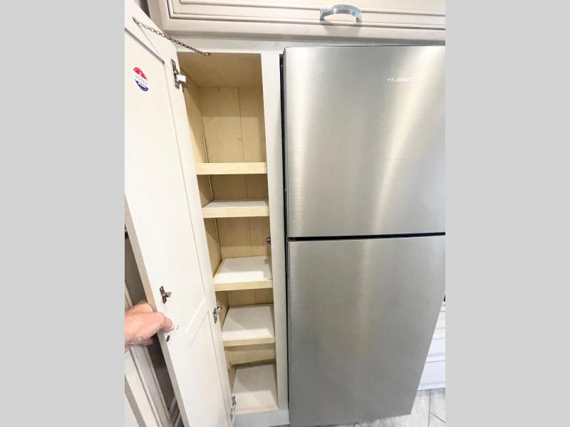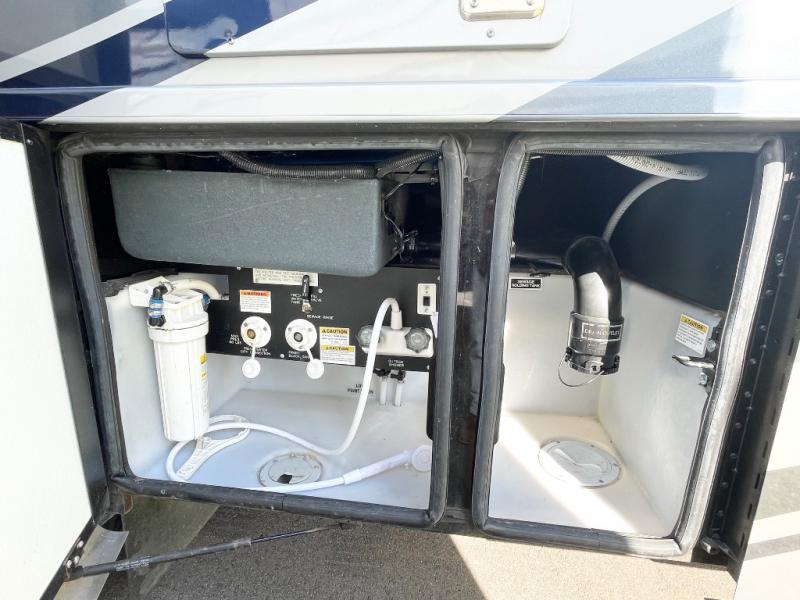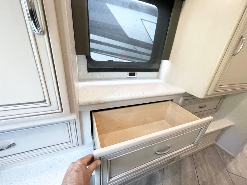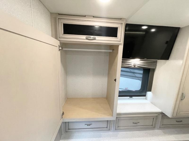 Your family will feel right at home in this spacious motorhome. The triple slides allow the kids room to play a game on the floor, and the adults can sit at the buffet table to enjoy coffee. Prepare a quick lunch in the stainless steel microwave before heading out to explore, and when you return the full bath will be waiting for you to clean up. This model includes Samsung LED TV's in the living room and the bedroom for all your entertainment needs, and the two Sony Blu-ray disc players allow you to enjoy movie night! Mom and dad will love the rear bedroom with its slide out king bed and dual shirt closets for all their clothes!