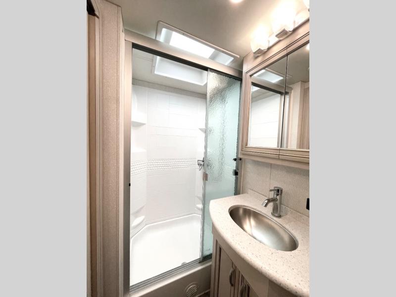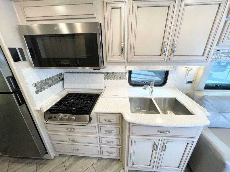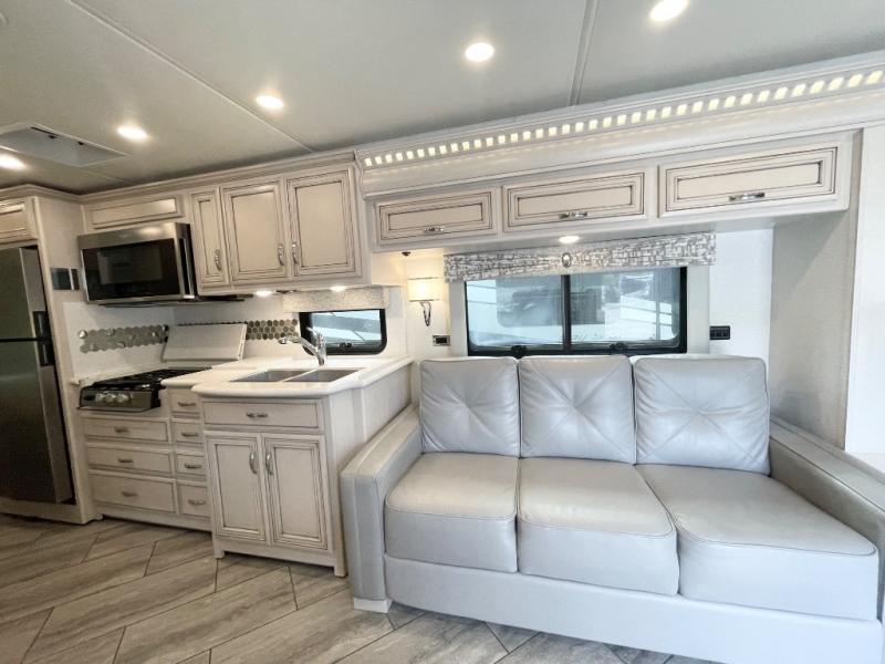 With any Bay Star Class A gas motorhome by Newmar you will be getting a quality motorhome that will make family time easier than ever. You will feel totally secure driving with the 7.3-liter V8 engine that sits on a Ford F-Series chassis, and features 350 HP to power your family vacations across the states. The electronic stability control will make the journey just as sweet as the destination, and the smart level hydraulic leveling jacks include a Bluetooth compatible touch pad to make set-up a breeze once you arrive. Each model is constructed with a BriteTEK roof with a walkable deck, aluminum-frame sidewalls and roof construction, plus Polar Pak R19 batten insulation in the roof so you can travel year around. The chef of the family will love the Bay Star kitchen with its handmade cabinetry, polished solid surface countertop with a stainless steel sink, plus vinyl flooring that is both eye-catching and easy to clean.