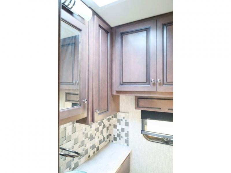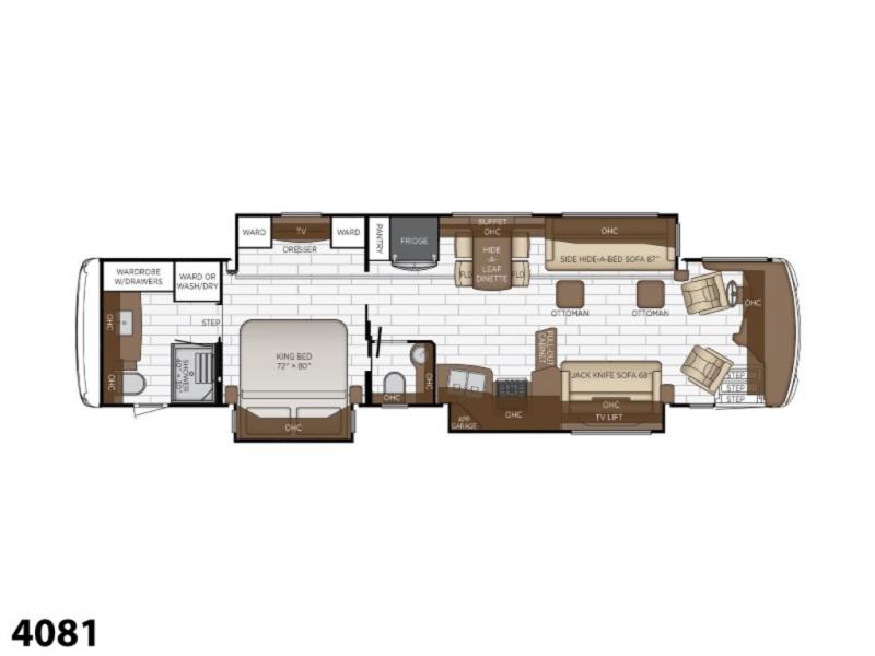 Are you looking to upgrade your motorhome to more luxurious unit? Look no further than this Dutch Star 4081. You will love the space provided by the full-wall slide and two additional slides, plus the rear bath cathedral ceiling will add extra height. Take a rest on the pillow top king bed or relax on the side hide-a-bed sofa with two ottomans. There is a passenger workstation and a hide-a-leaf dinette if you're needing to get some work done while on vacation, and the power awning outside will provide shade if you're wanting to work in fresh air. Don't worry about stopping for food because this model includes a Whirlpool 19.7 cu. ft. stainless steel refrigerator that will allow you to stock up for the week, and you can cook with the stainless steel convection microwave with a three burner recessed gas cooktop!