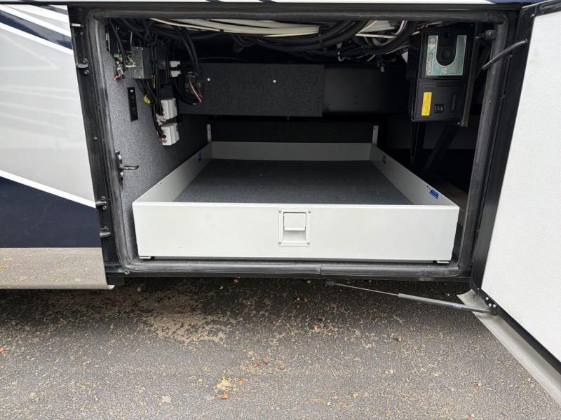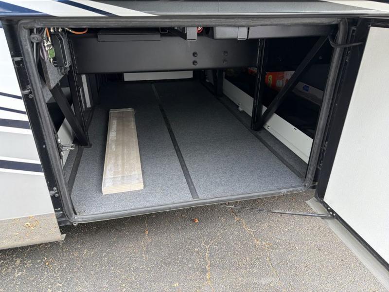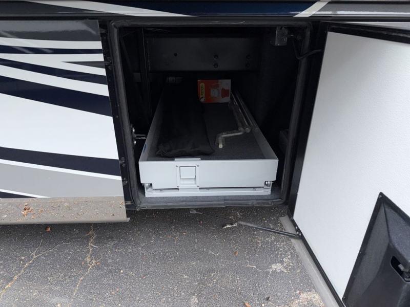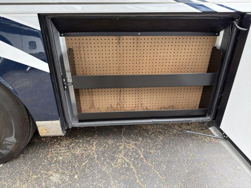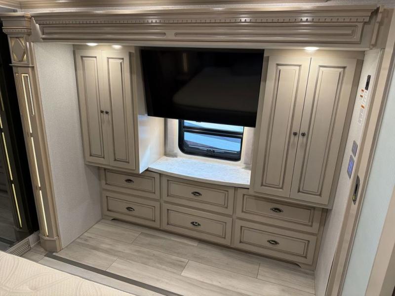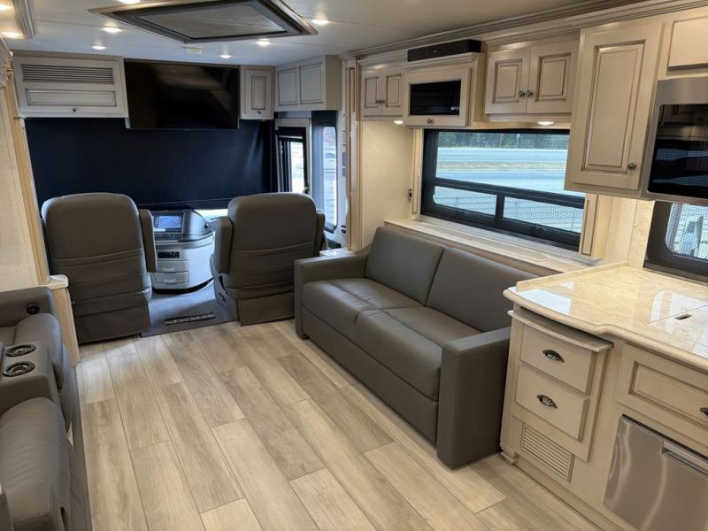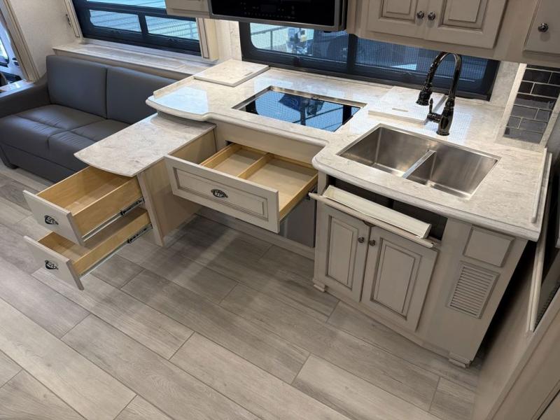 Luxury is waiting for you in this spacious motorhome that can comfortably sleep five each night. The full-wall slide plus two additional slides will open up the whole unit for a more at-home feel. Relax on the hide-a-bed sofa with two ottomans or read a book on the jack-knife sofa. The passenger workstation or hide-a-leaf dinette will be the perfect place to catch up on some work while you're away from home. Easily prepare breakfast, lunch, and dinner on the three burner recessed gas cooktop, or use the convenient stainless steel convection microwave. This model features a master bedroom with a slide out pillow top king bed, dual wardrobes and a dresser, plus a 4K LED TV. You will love the rear bath cathedral ceiling that will add additional height, plus there is plenty of storage space and two bath sinks so you and your spouse can freshen up at once!