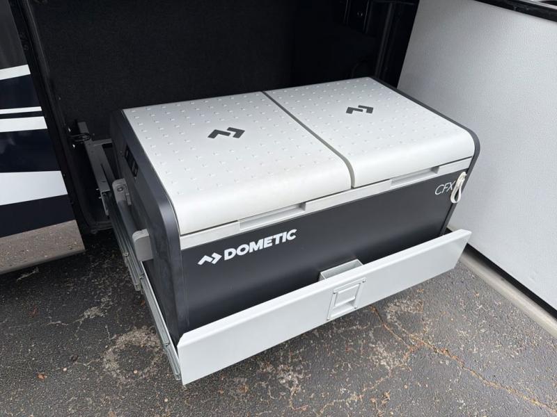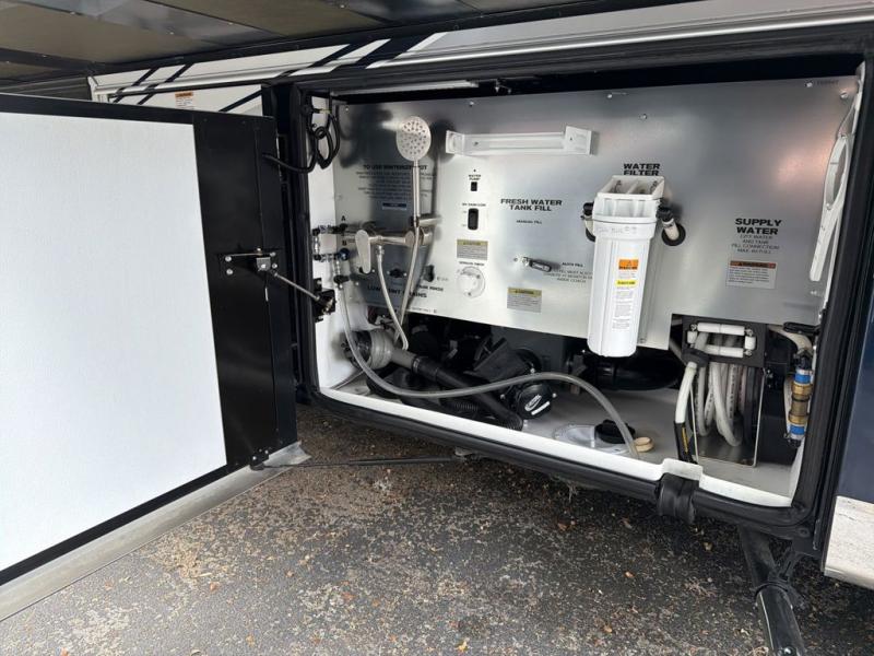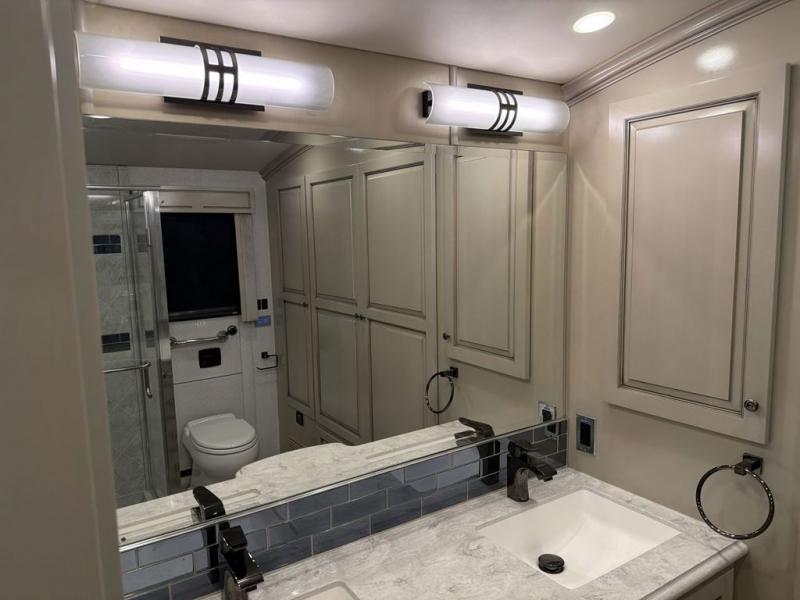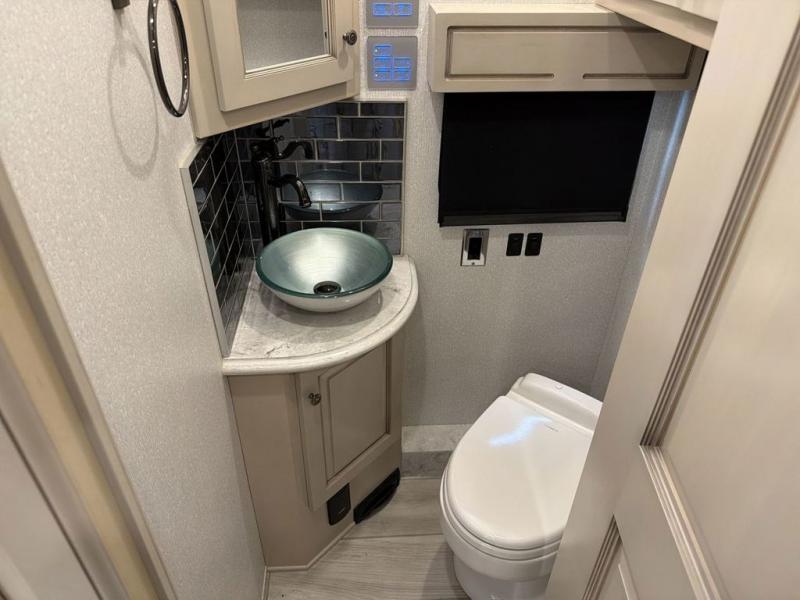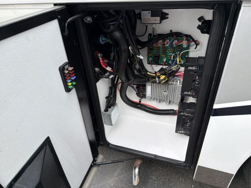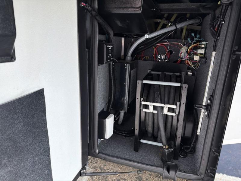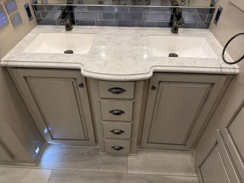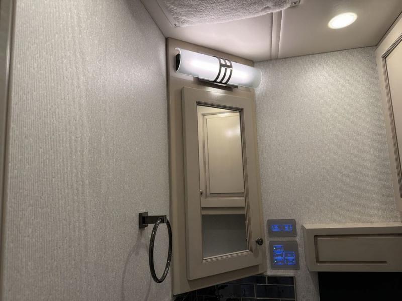 Luxury is waiting for you in this spacious motorhome that can comfortably sleep five each night. The full-wall slide plus two additional slides will open up the whole unit for a more at-home feel. Relax on the hide-a-bed sofa with two ottomans or read a book on the jack-knife sofa. The passenger workstation or hide-a-leaf dinette will be the perfect place to catch up on some work while you're away from home. Easily prepare breakfast, lunch, and dinner on the three burner recessed gas cooktop, or use the convenient stainless steel convection microwave. This model features a master bedroom with a slide out pillow top king bed, dual wardrobes and a dresser, plus a 4K LED TV. You will love the rear bath cathedral ceiling that will add additional height, plus there is plenty of storage space and two bath sinks so you and your spouse can freshen up at once!