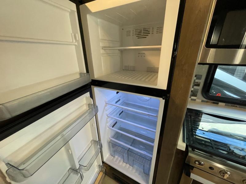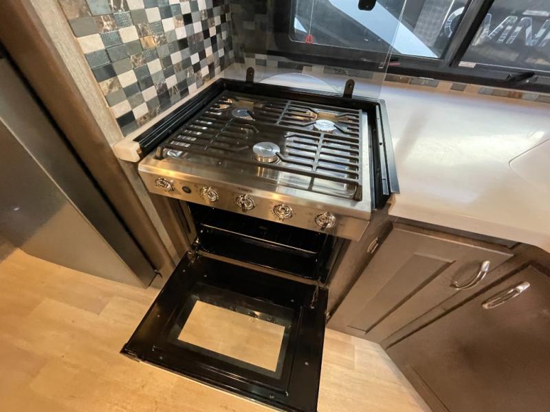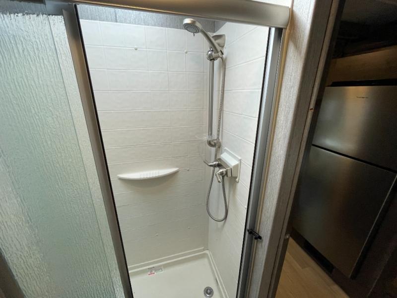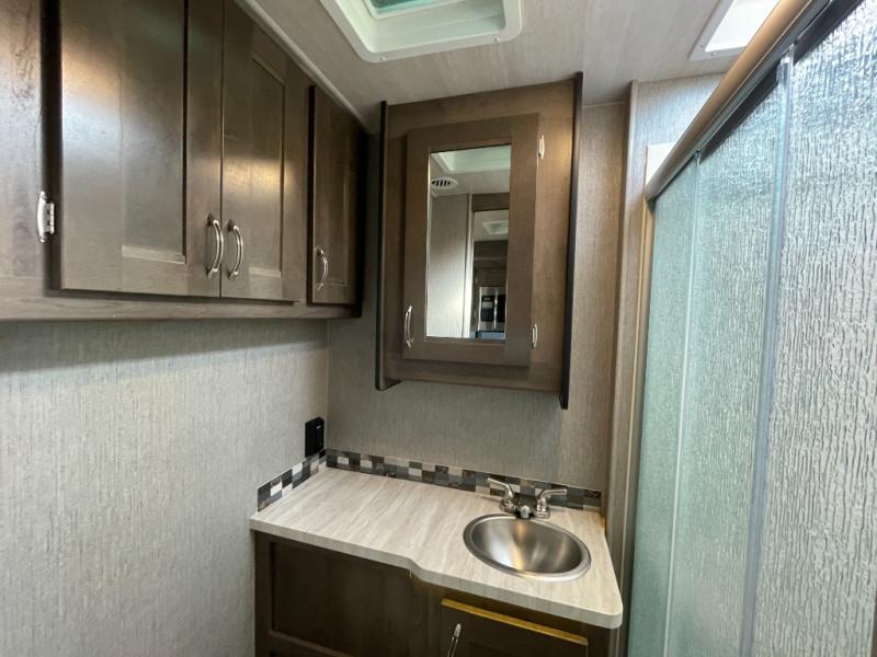 Inside, you’ll find a fully equipped kitchen with ample counter space, residential-style appliances, and generous storage for cookware and supplies. The living area provides comfortable seating and a welcoming space to relax, while the private sleeping areas ensure restful nights wherever the road takes you. The full bathroom includes a shower, vanity, and practical storage, making life on the road easy and convenient.