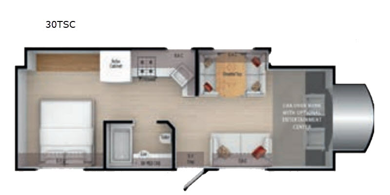 The Triumph Super C diesel motorhomes are constructed with a high strength low allow lightweight steel cage, a fiberglass front cap, and a rear back up camera to make each adventure hassle free. The electric awning with LED lighting will provide an outdoor living space, and you can store camp gear in the rubber-lined galvanized trunk boxes. Each model features upgraded lino flooring, window treatments, and a stainless steel sink to provide that extra touch-of home. These models also include a 40" TV in the living room to watch your favorite shows and the LED lighting will make each room bright and inviting.
