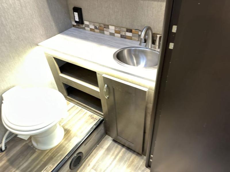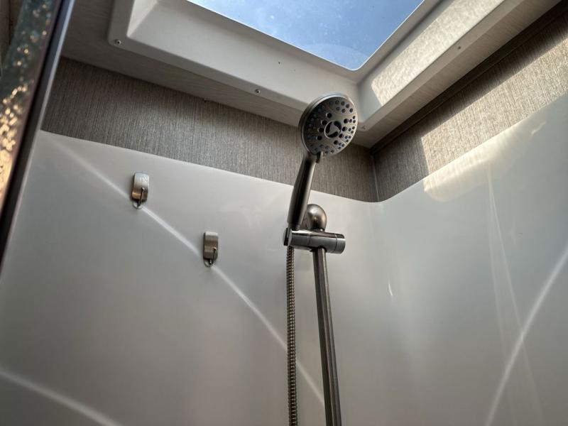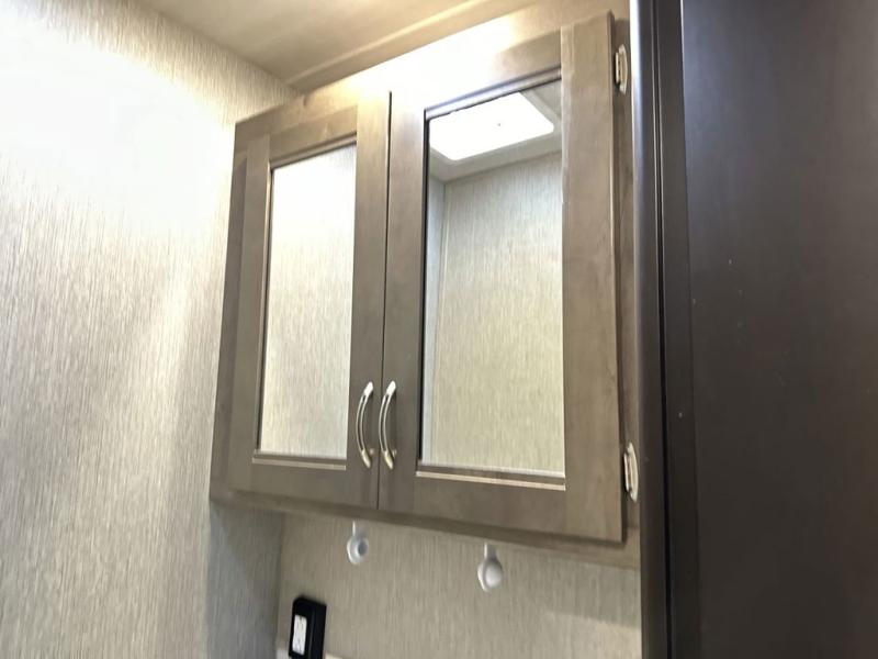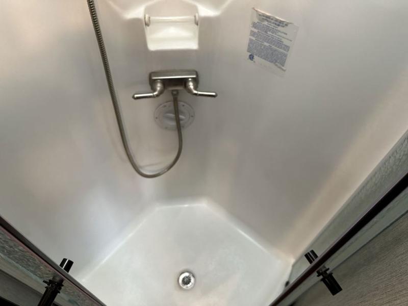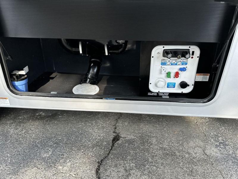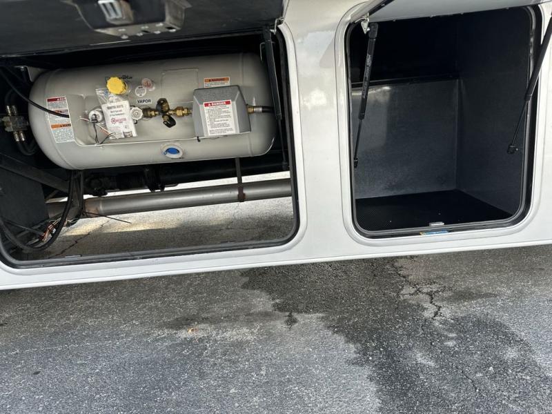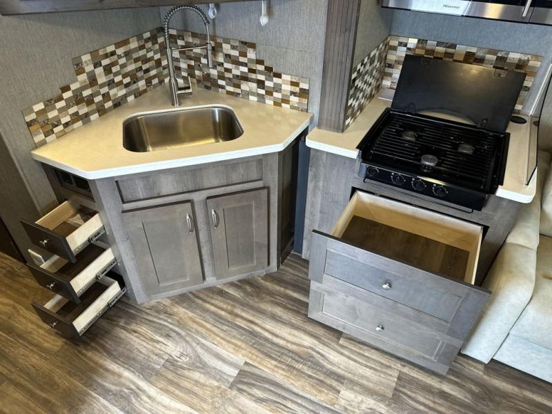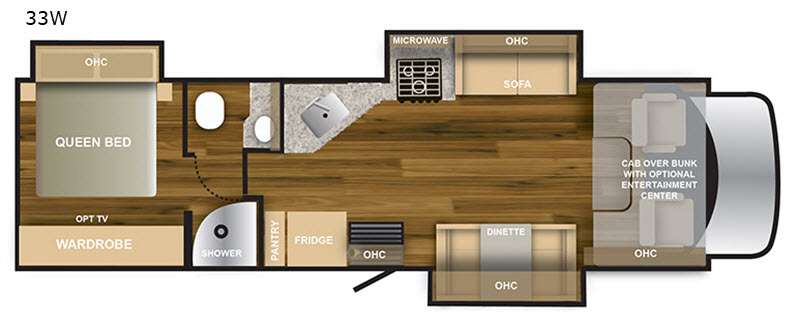 There is plenty of space to walk around this motorhome with its three slides! You can choose to add an optional entertainment center to the cab over bunk and an optional TV to the rear private bedroom. Inside the bedroom there is also a queen bed slide with overhead cabinets and access to the separated bathroom. Grab some eggs and bacon from the Whirlpool electric refrigerator and cook them up on the three burner range then enjoy them at the booth dinette slide. The sofa is a great place to take an afternoon nap after a fun day outdoors, and the outside shower helps to keep the dirt and sand outside!