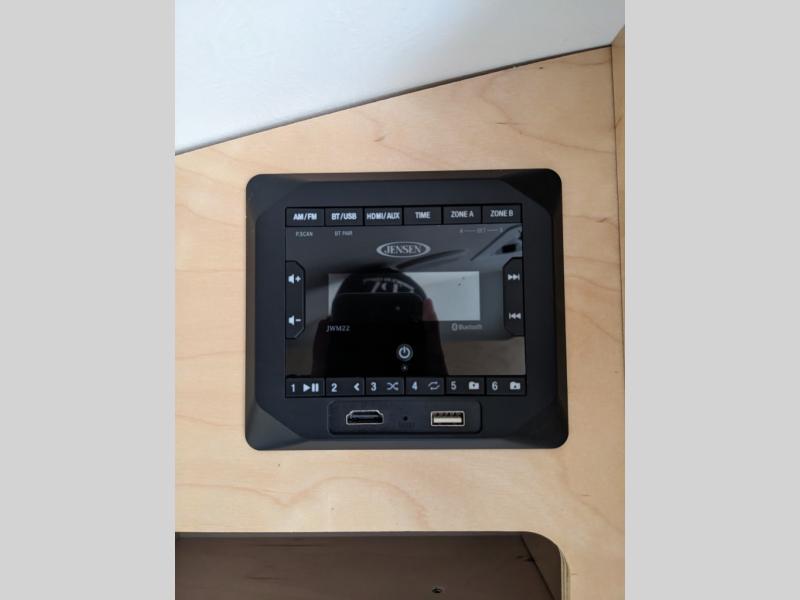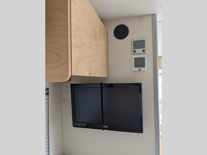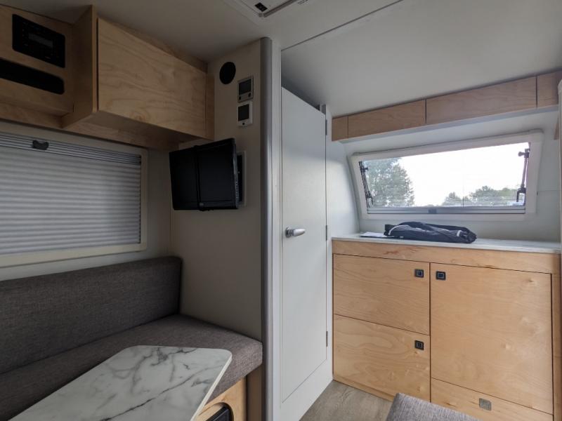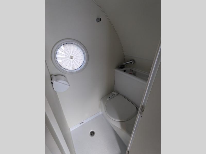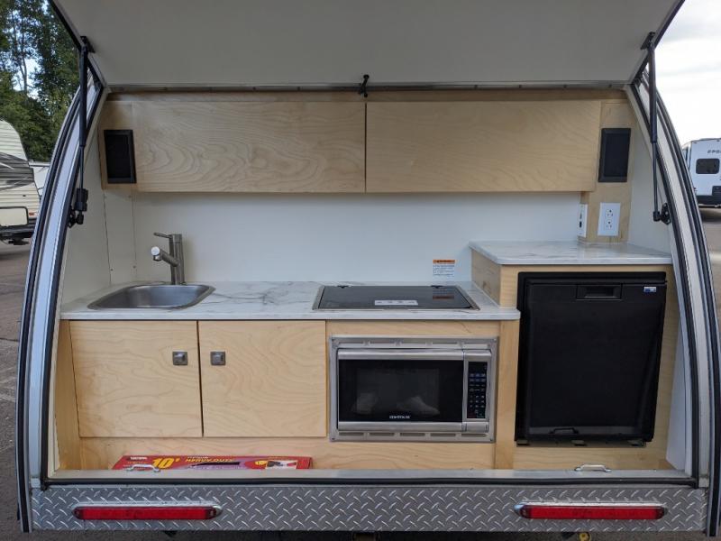 Why not camp as happy as a clam in this teardrop that offers comfortable accommodations inside and an outside kitchen in the rear hatch for outdoor cooking! Inside, the U-Shaped seating can be utilizes for dining, playing games or working then becomes your expandable full/split bed, whichever you choose to setup for the night. Your electronics will stay charged with the dual 110/USB ports, and you can watch the 19" TV when you want to relax inside. There is a wet bath complete with a toilet, sink and shower to keep you refreshed, plus there is an exterior shower.