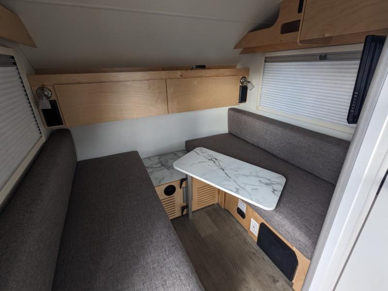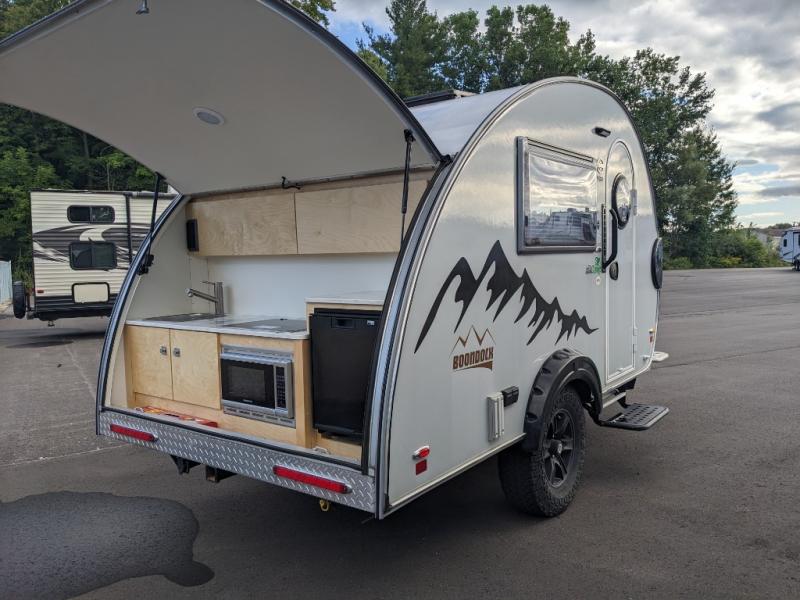 With any TAB 320 teardrop trailer by nüCamp RV, you will enjoy the iconic design and all the features from the outside to the inside! Some that stand out include the large diamond plate LP/battery storage on the front, the alloy wheels, the tongue mounted spare and the Nautilus water management system. The interior offers soft closed cabinetry, Cobblestone premium fabric, an air conditioner and many more comforts and conveniences. And if you enjoy taking the road less traveled, then you will certainly want to consider adding on the optional Boondock package. These optional features, like the aggressive off-road tires and the heavy-duty pitched axle, give you a leg up as you adventure throughout any rugged terrain.