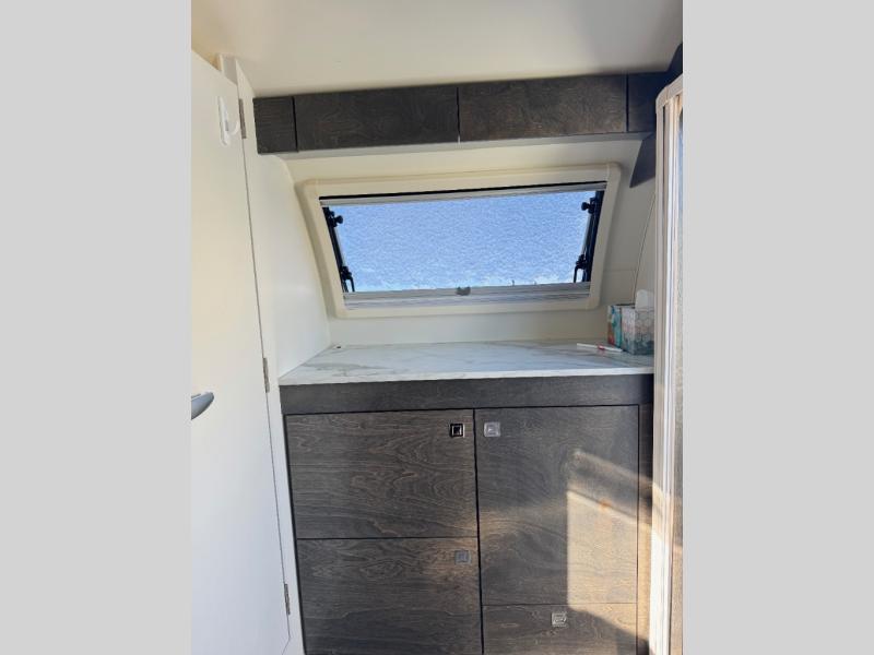 Why not camp as happy as a clam in this teardrop that offers comfortable accommodations inside and an outside kitchen in the rear hatch for outdoor cooking! Inside, the U-Shaped seating can be utilizes for dining, playing games or working then becomes your expandable full/split bed, whichever you choose to setup for the night. Your electronics will stay charged with the dual 110/USB ports, and you can watch the 19" TV when you want to relax inside. There is a wet bath complete with a toilet, sink and shower to keep you refreshed, plus there is an exterior shower.