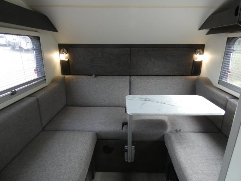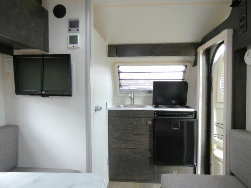 When you decide to take off, it is easy with this teardrop! You can explore the hillside or the valleys and sleep inside in total comfort on the U-Shaped seating that becomes your expandable full/split bed, whichever you choose to setup for the night. Your electronics will stay charged with the dual 110/USB ports, and your tummies will stay full using the galley kitchen amenities. There is a wet bath complete with a toilet, sink and shower to keep you refreshed, plus there is an exterior shower.