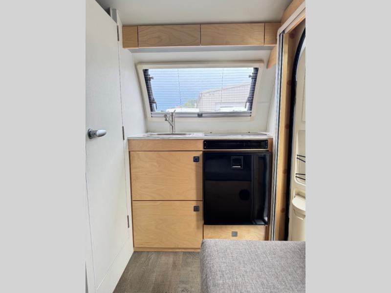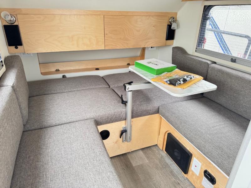 With any TAB 320 teardrop trailer by nüCamp RV, you will enjoy the iconic design and all the features from the outside to the inside! Some that stand out include the large diamond plate LP/battery storage on the front, the alloy wheels, the tongue mounted spare and the Nautilus water management system. The interior offers soft closed cabinetry, Cobblestone premium fabric, an air conditioner and many more comforts and conveniences. And if you enjoy taking the road less traveled, then you will certainly want to consider adding on the optional Boondock package. These optional features, like the aggressive off-road tires and the heavy-duty pitched axle, give you a leg up as you adventure throughout any rugged terrain.