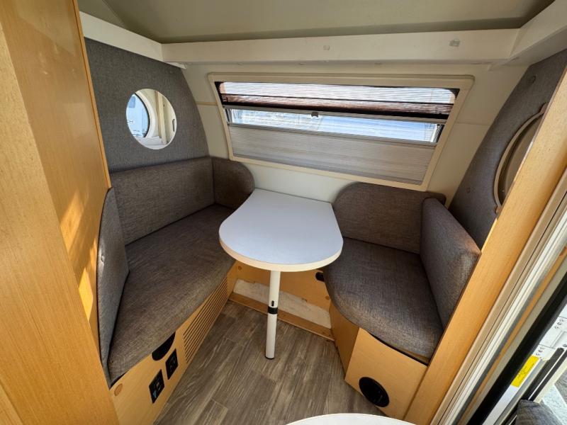 Easy to tow and clean, this TAB 400 teardrop trailer will have you scheduling all your camping excursions for the year! You will have your own RV queen bed while your little one sleeps on the second sleeping area that has been converted from two seats and a dining table into a bed. Everyone can stay clean and refreshed after hiking the trails thanks to the wet bath with fold-down sink. You can make meals inside on the two-burner stove and store your leftovers in the two-way refrigerator. At night, be sure to look out the front window at the stars and enjoy the air conditioning or heat depending on the season. With this model, you also have the option to switch out the two-way refrigerator for the optional three-way refrigerator.