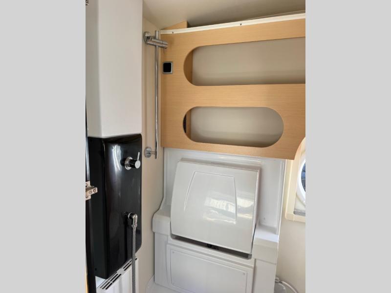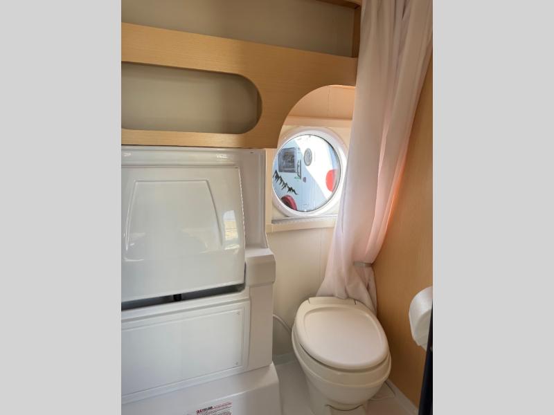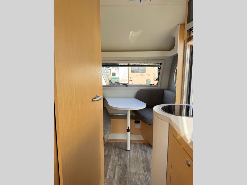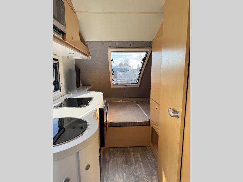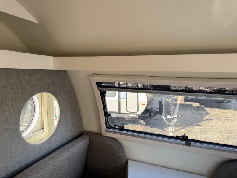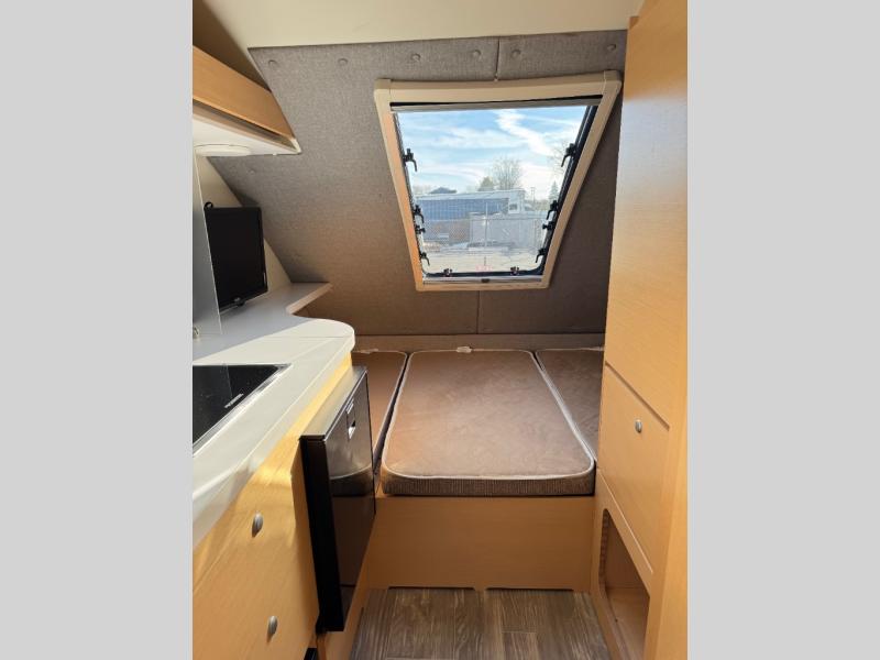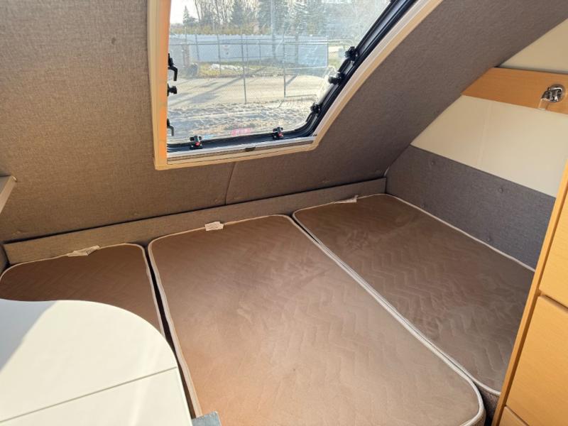 Easy to tow and clean, this TAB 400 teardrop trailer will have you scheduling all your camping excursions for the year! You will have your own RV queen bed while your little one sleeps on the second sleeping area that has been converted from two seats and a dining table into a bed. Everyone can stay clean and refreshed after hiking the trails thanks to the wet bath with fold-down sink. You can make meals inside on the two-burner stove and store your leftovers in the two-way refrigerator. At night, be sure to look out the front window at the stars and enjoy the air conditioning or heat depending on the season. With this model, you also have the option to switch out the two-way refrigerator for the optional three-way refrigerator.