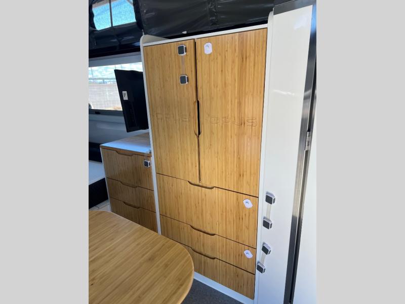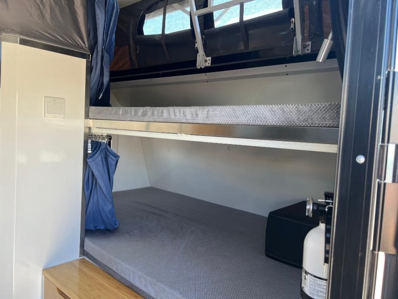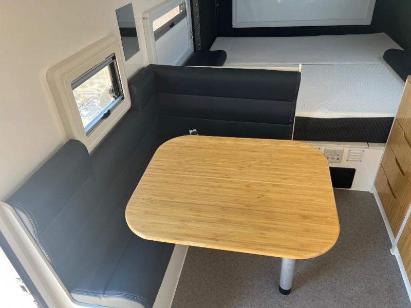 With this OPUS Overlander travel trailer, you will enjoy the luxurious interior cabin including leatherette dining, a full-size bamboo wardrobe, and a shower/toilet combo to freshen up after exploring outside. Stay cool or warm with the Truma heater and hot water system and the 13,500 BTU air conditioner as you sleep on the king-size bed, the bunk beds, or the lounge which will sleep one more. The cook can make breakfast on the exterior stainless steel kitchen slide with a four-burner stovetop, a stainless steel chopping board, plus more. And the 12V refrigerator will keep your leftovers and drinks cool. There is storage inside for your clothing and such as well as outside for your outdoor gear, and the expanding roof is a bonus feature for more head room.
